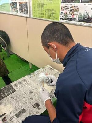 そして本日、自衛隊の京都地方協力本部の方々を講師に招き、防災講話と衛生技術の実習を行いました。防災講話では、災害時に「共助」として行われる地域の活動が大きな支援を担っていることを知り、自分たちにできることをしっかりやらなければという自覚を持ち、講演を聴いていたように思います。また、実習では身近なものを使い骨折時の処置や搬送方法を学びました。