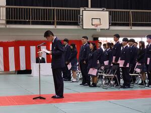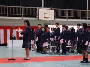 校長先生の式辞では、『今年、何かやりたいことはありますか?将来の夢に向けて、「これだけはやっておこう」と思っていることはあるでしょうか?夢がはっきりしないからといって、何もしなくていいということにはなりません。今いる場所から、自分を、一段レベルアップさせる。そのための3学期にしてほしいと思います。まだ目標がはっきり決まっていない人は、「夢」でなくてもかまいません。この学期に、自分が乗り越える山を一つ選んでみてください。3学期は短い。本当に、あっという間です。しかし、自分のレベルを一段上げるには、十分な長さでもあります。今日から、その一歩を踏み出しましょう。』と話されました。