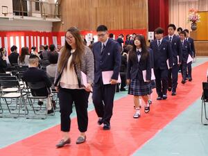 校長先生の式辞では「学び続ける意欲を持ち続けてほしい」「社会に貢献する心を大切にしてください」「感謝する姿勢を大切にしてほしい」の3つの餞の言葉が贈られました。