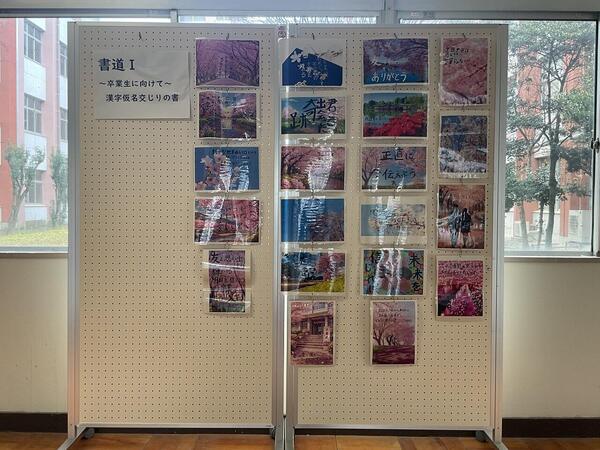 書道Ⅰの「漢字仮名交じりの書」の授業において、卒業生に向け、各自が選んだ卒業にまつわる歌詞を筆で書き、文字をiPadに取り込み、春らしい画像を合わせた作品を制作しました。