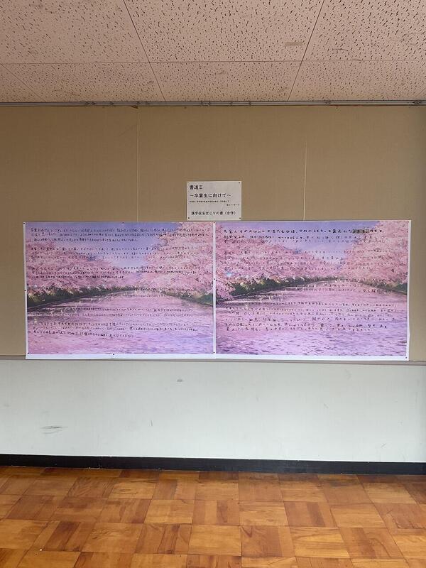 書道Ⅱの「漢字仮名交じりの書」の授業において、卒業生の名前の一文字を入れたメッセージを作成し、分担して筆で文字を書いたものをiPadに取り込み、春らしい画像を合わせた作品を制作しました。