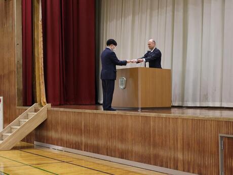 校長先生の式辞では、『今年度、皆さんに身につけてほしい力として、「目標に向けて決めたことを、続ける力」 です。続ける上で大切なことは、「一日も休まないこと」ではありません。何度途切れても、何度でも再開する。それが大切です。二つ目は、目標を達成するために、どのような事をすればいいのか、何をクリアーしていく必要があるのかをよく考えてください。自分なりのスモールステップを考え、積み重ねていってください。皆さんが今年度、自分で選んだ道を、少しずつでも歩み続けてくれることを願っています。』と話されました。