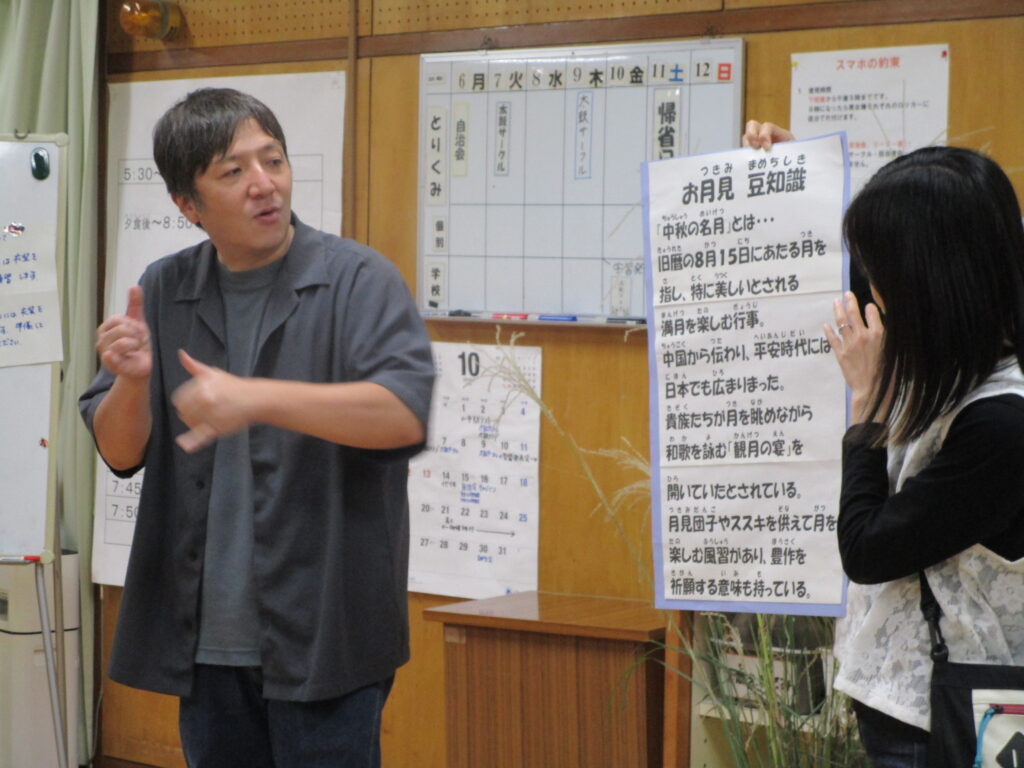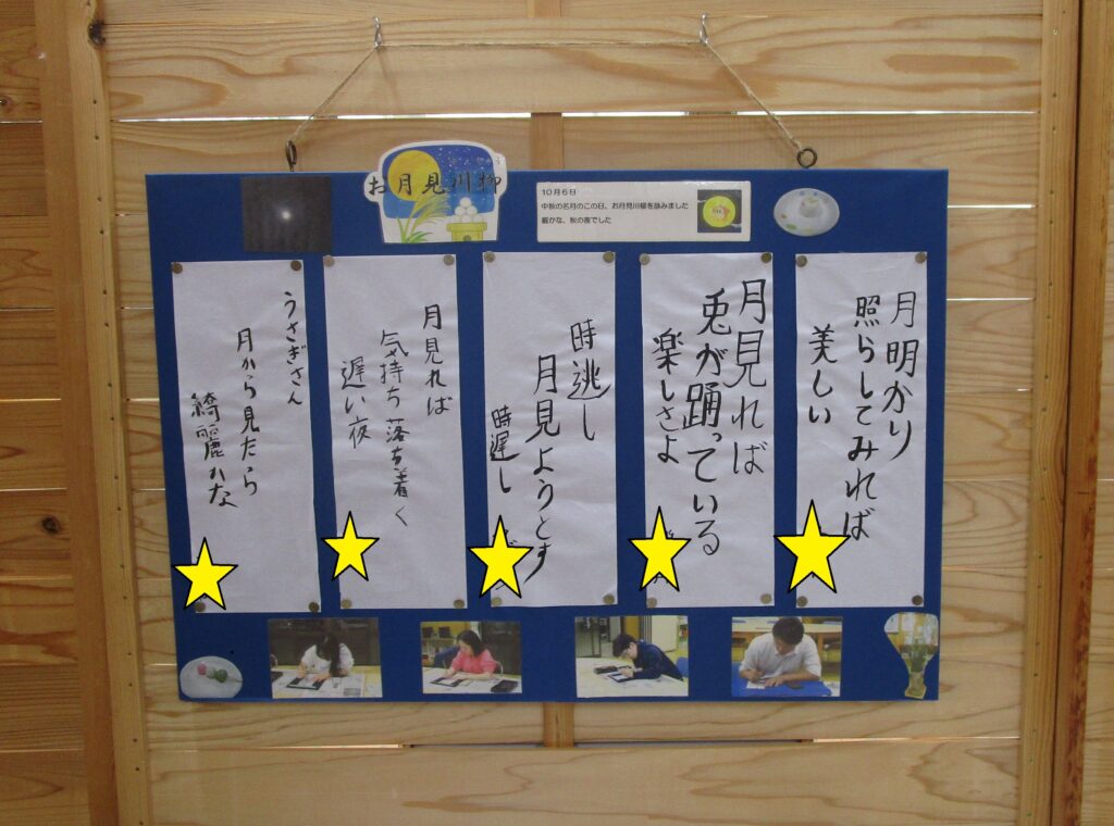 10月27日 寄宿舎日記 『徒然Diary(つれづれダイアリー)』中秋の名月 寄宿舎 2025.10.27 『徒然Diary』 2025/10/27 中秋の名月 10月6日(月)のこの日は、中秋の名月でした。 月曜日ということで、自治会の中で『お月見豆知識』の学習と、『お月見○✖クイズ』を楽しみました。初めて知ることが多く「へ~」とささやかながら学びの機会になりました。 クイズの後は、お月見川柳をみんなで考えました。 それぞれに、今の心境を反映させた素敵な川柳を書き上げました。 できあがった川柳は、学習発表会で作品として展示しました。 Post Views: 45