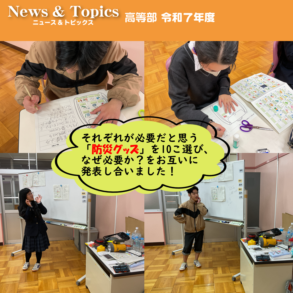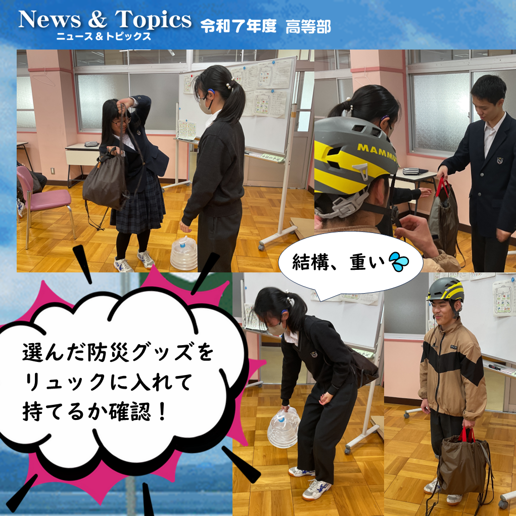 別の日には、防災リュックに入れる「防災グッズ」をそれぞれ選び、「どうしてこれを選んだのか」を発表しました。家庭科の時間に作った防災リュックに実際に入れて背負ってみると、「思ったより重たい!」「減らすなら何を減らす?」など、感じたことを話し合う様子が見られました。