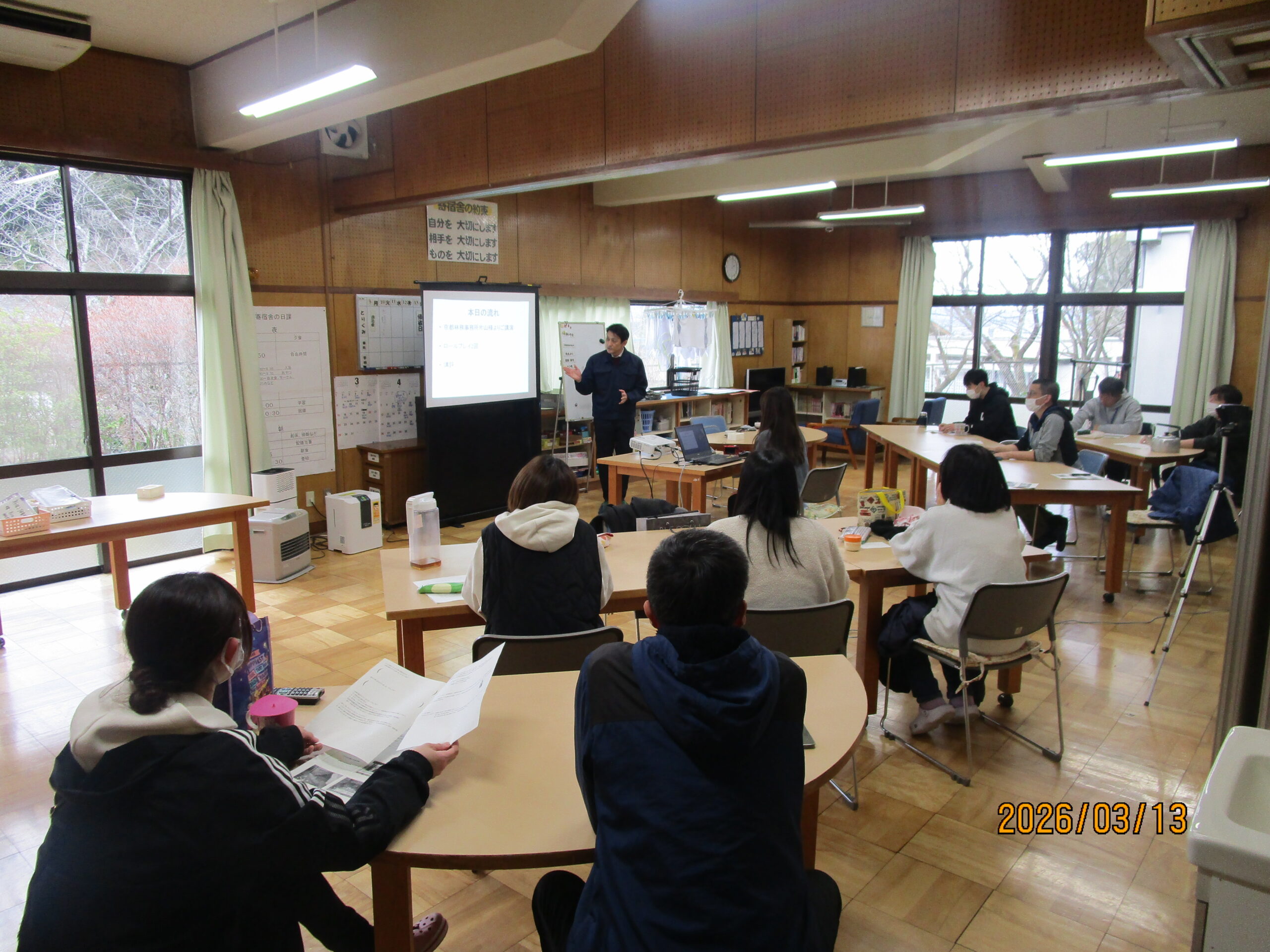 3月30日 寄宿舎日記 『徒然Diary(つれづれダイアリー)』寄宿舎 熊対応研修 寄宿舎 2026.03.30 『徒然Diary』 2026/03/30 寄宿舎 熊対応研修 京都府京都林務事務所の方を講師に招き、熊の生態と出没の理解について職員向けに研修会を行いました。 令和7年度は熊に関するニュースが多く、本校でも被害にあわないために、どういった対策が必要か学びました。 Post Views: 38