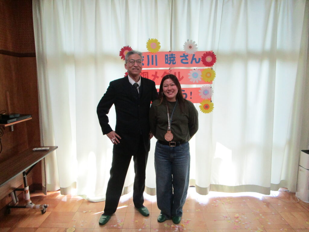 11月に東京で行われたデフリンピック。平成28年度寄宿舎卒業生の衣川暁さんが柔道競技に出場し、個人で銅メダルを獲得しました。その衣川さんがメダルを持って遊びに来てくれました。残念ながら舎生は登校した後だったので、直接見せてもらうことはできませんでしたが、校長先生にも来てもらい、先生達でお祝いしました。