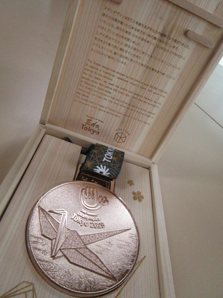 本物の銅メダルは和をイメージした木箱に入っていて、重厚感がありずっしりと重かったです。