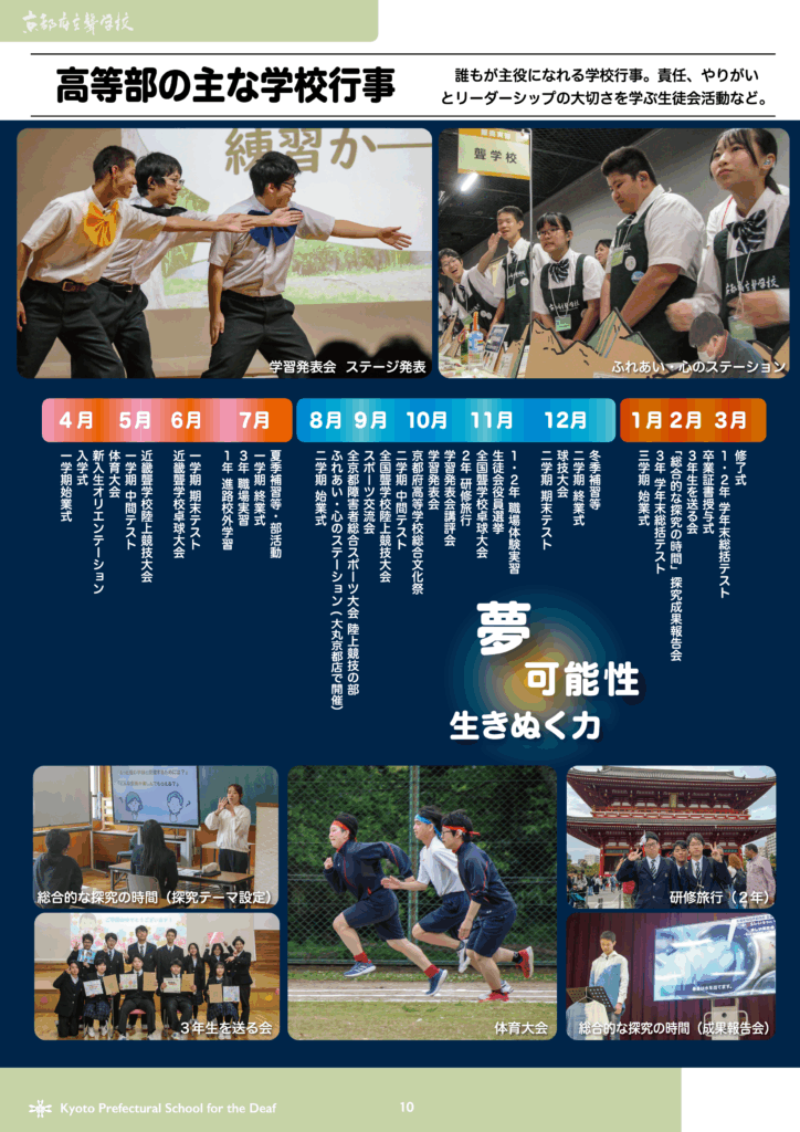 高等部紹介 高等部 2025.12.032022.12.26 ◇高等部公式インスタグラム、始めました。 フォローをよろしくお願いします。 京都府立聾学校高等部公式インスタグラム運用ポリシー(PDF)はこちらダウンロード ◇高等部 設置学科コースのごあんない (3学科4コース) ※各学科・コース名をクリックしてください 大学進学を実現する2つの専門学科 情 報 科 (文・理系大学) 京都アート科(文・芸術系大学) 多様な進路に対応した、普通科の2コース 普通科ベーシック(進学・就職) 普通科わあく(福祉就労・就職) ◇出願・入試について 詳しくは、本校高等部までお問い合わせください。 ◇高等部の様子 ◇令和7年度高等部案内パンフレット r07高等部学校案内パンフallダウンロード Post Views: 4,927