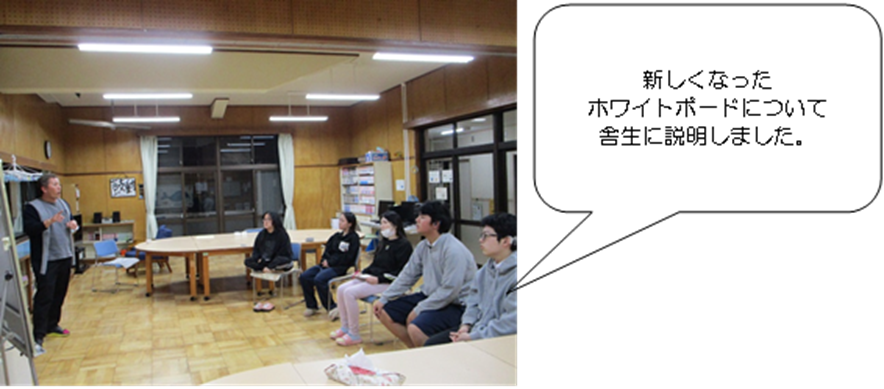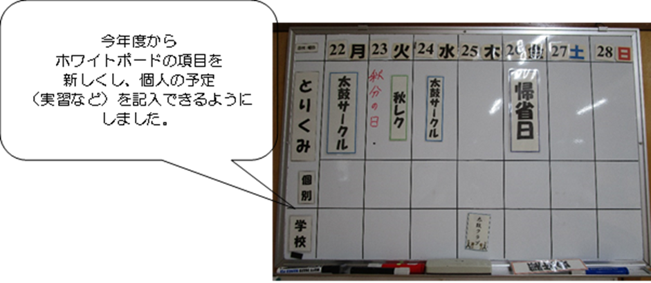 1週間の予定は、ホワイトボードでいつでも確認できるようにしていて、自治会の司会を担当する舎生が貼り替えます。舎生は、ホワイトボードを見て見通しを持ったり、行事の担当者会議やサークルに向かう気持ちを整えたりしています。