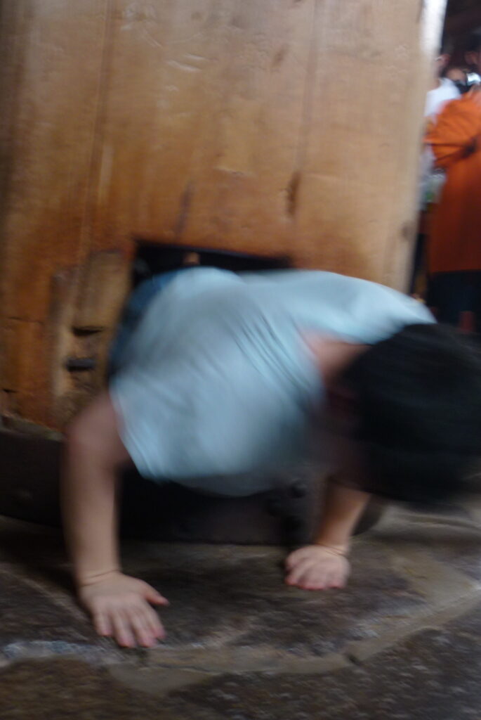 柱くぐりにも挑戦。この柱の穴、実は大仏の鼻の穴と同じ大きさなのだそうです。