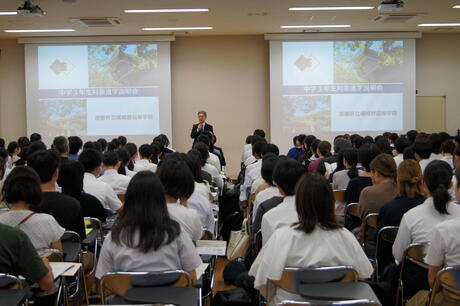 内容は9月20日に開催した内容と同じで、全体会では校長挨拶をはじめ、入学者選抜の概要や、独自学力検査問題の出題方針や学習方法について説明しました。また、本校生徒が高校生活の様子や受験勉強のアドバイスについて話しました。その後、教員や生徒による個別相談、施設見学をおこないました。