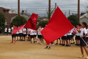 全ての競技において、生徒達は全力で取り組みましたが、やはり盛り上がりの桁が違うのが、クラス対抗リレーや団対抗リレーです。出場選手はもちろん、各団・各クラスで制作した応援旗を大きく振り、観覧席も全力で応援します。