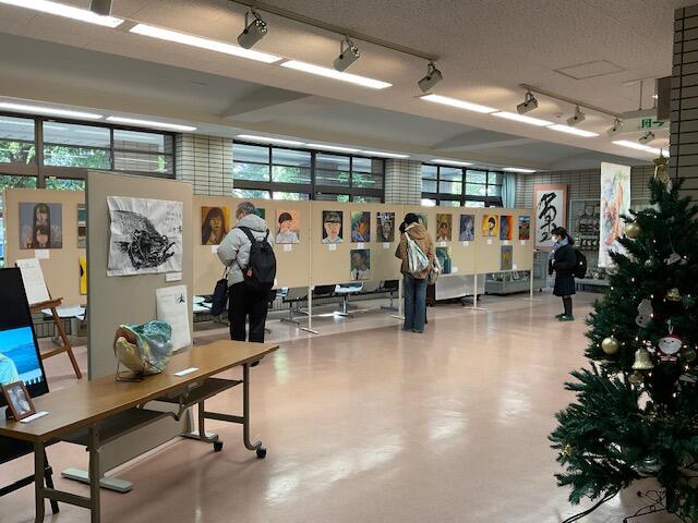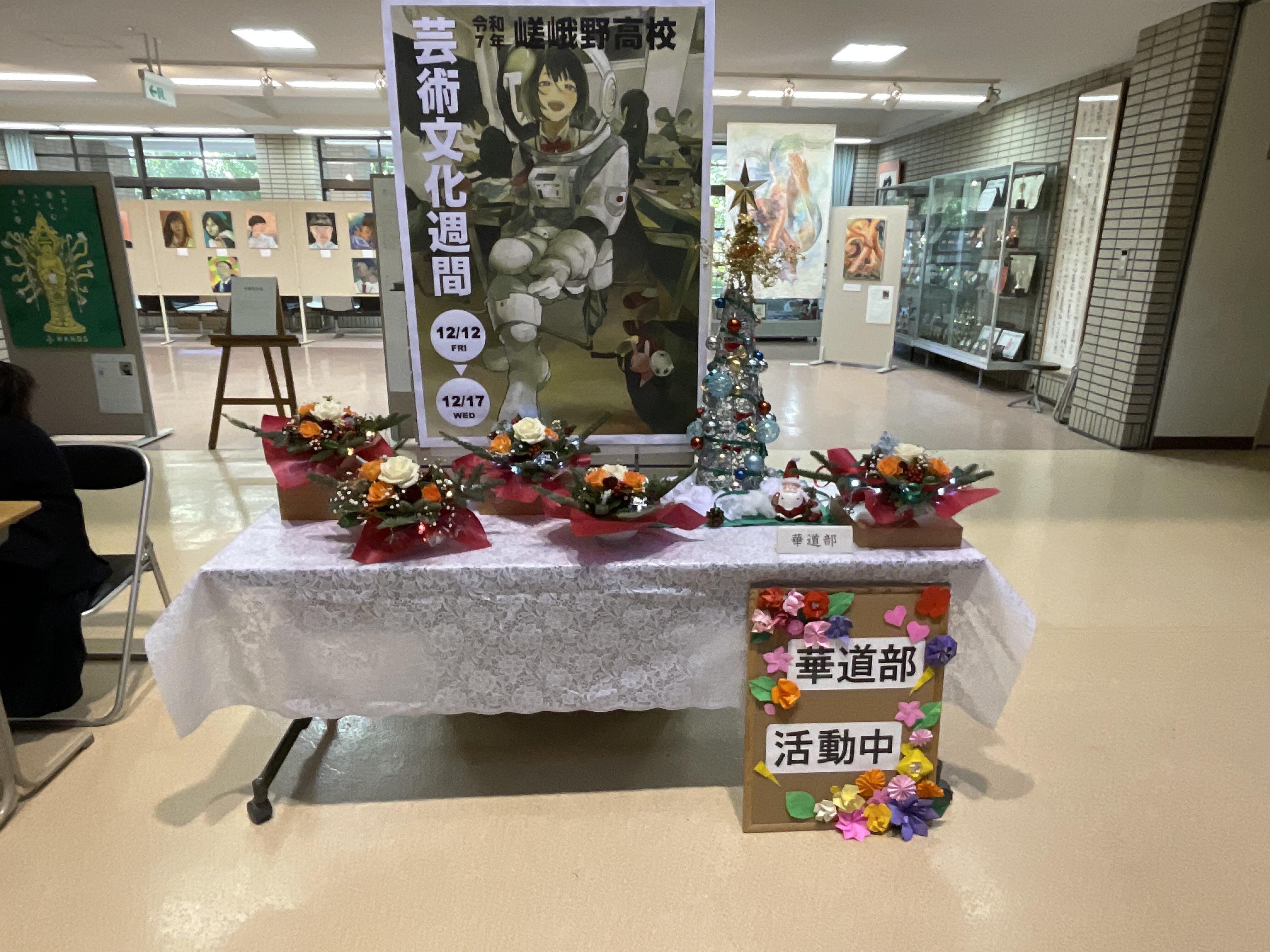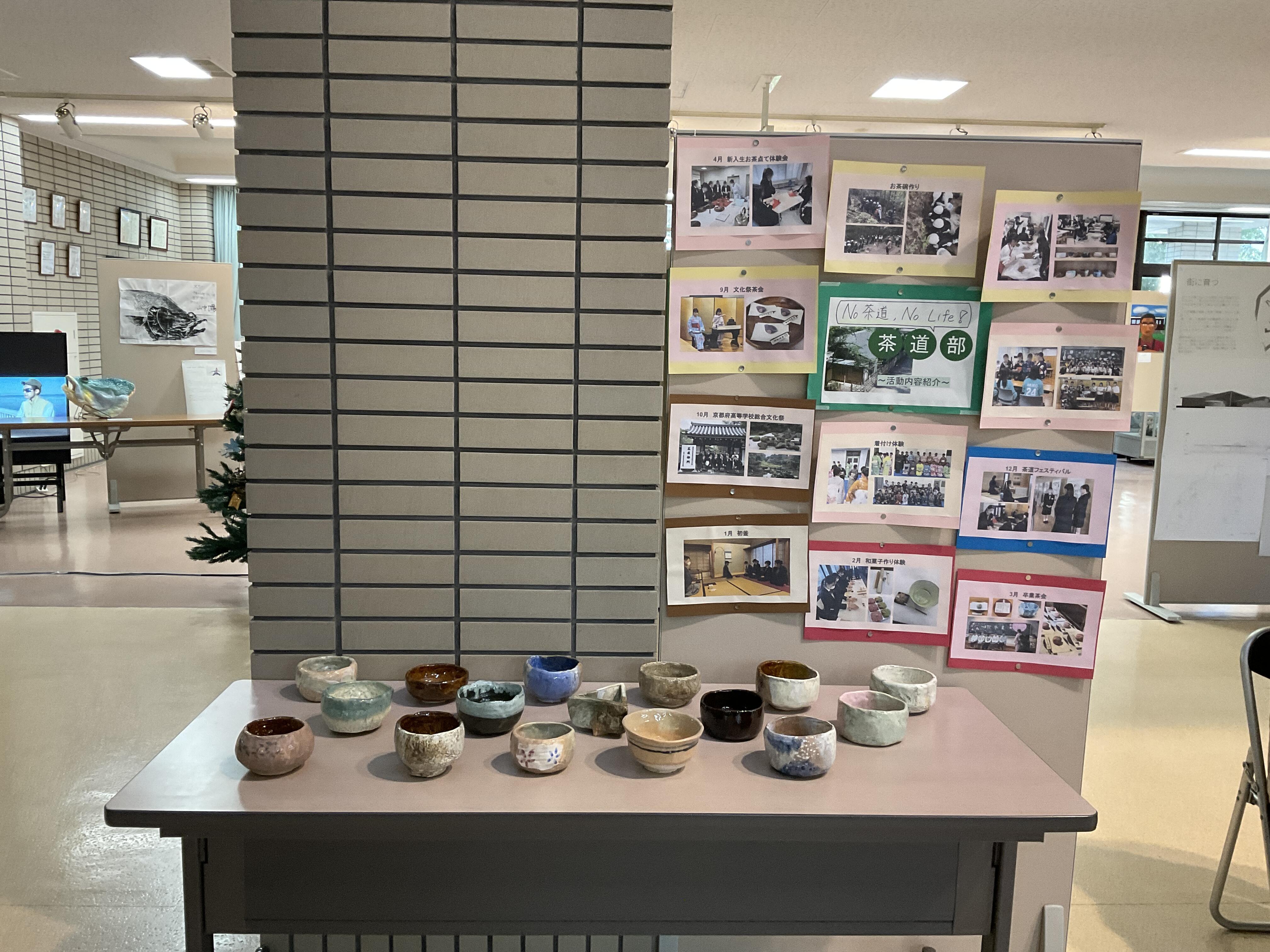 授業作品はもちろん、クラブの作品も力作揃いです。茶道部は校有林で採った土で制作した茶碗、華道部はクリスマスに合わせた華やかな作品、放送部は全国大会や近畿大会出場を果たした映像作品の上映、美術部、デザイン工芸部、写真部は作品展示を行いました。