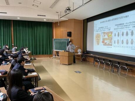講師の稲田圭さんは本校の卒業生で、現在は京都大学大学院の博士後期課程で昆虫の遺伝子に関する研究に取り組んでおられます。一昨年度よりSSLⅡのTAとして生物ラボの課題研究指導にも来ていただいており、今回は初めて講義をしていただきました。