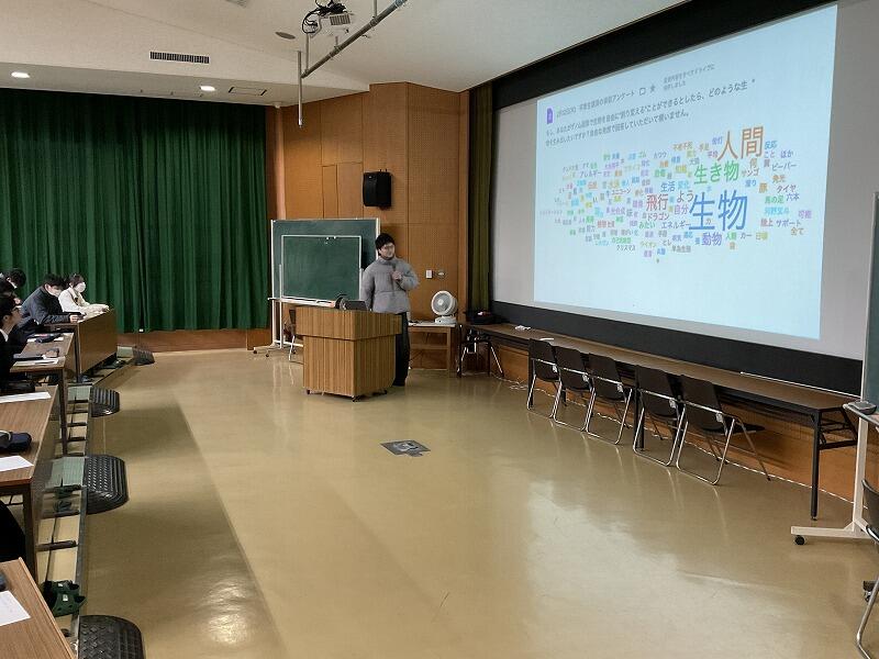 稲田さんからは、あらかじめ「もし、あなたがゲノム編集で生物を自由に"創り変える"ことができるとしたら、どのような生物を生み出したいですか?」という問が投げかけられており、1年生の回答をもとに、さまざまな実在する様々な生物の生態やゲノム編集の可能性について教えていただきました。次に、現在研究しておられるマダラシミの特定遺伝子欠失が形態形成に与える影響に関して話しをしていただきました。