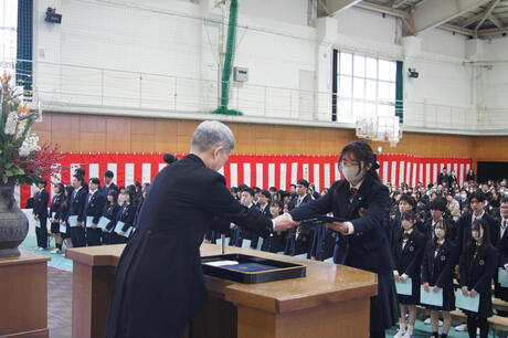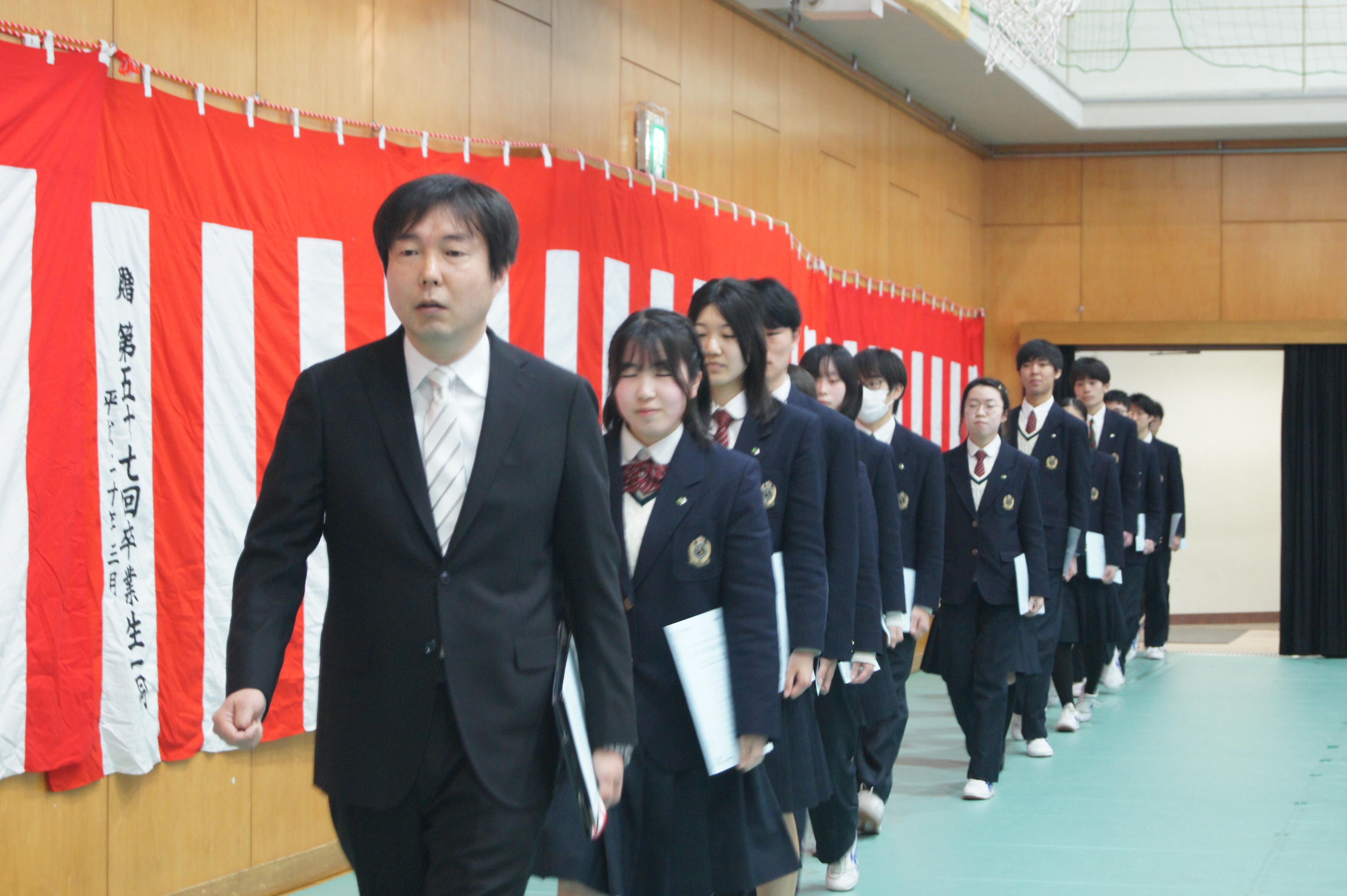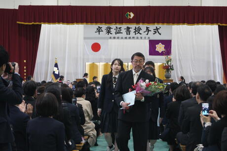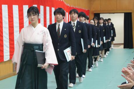 退場の花道では、保護者のみなさんや教職員に見送られ、それぞれの想いを胸に歩を進めていました。巣立っていく喜びの中に一抹の寂しさがこみ上げてくるのでしょうか、笑顔の中に時々こみ上げてくるものを必死でこらえている生徒の姿も・・・・