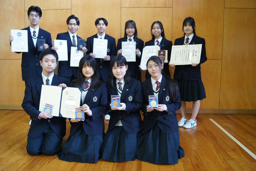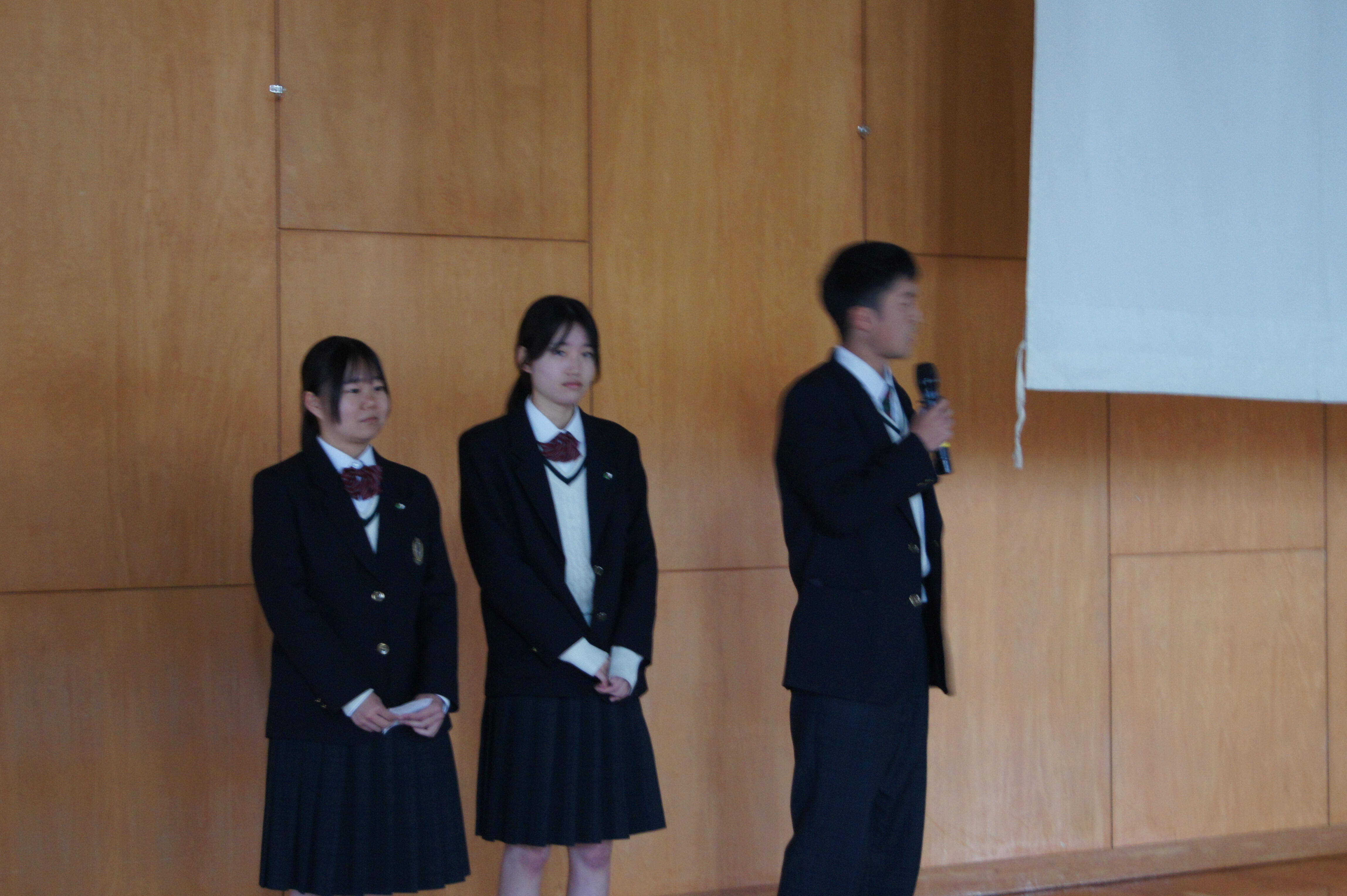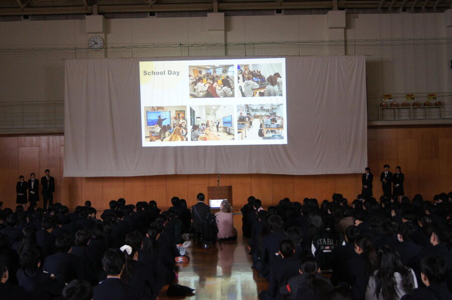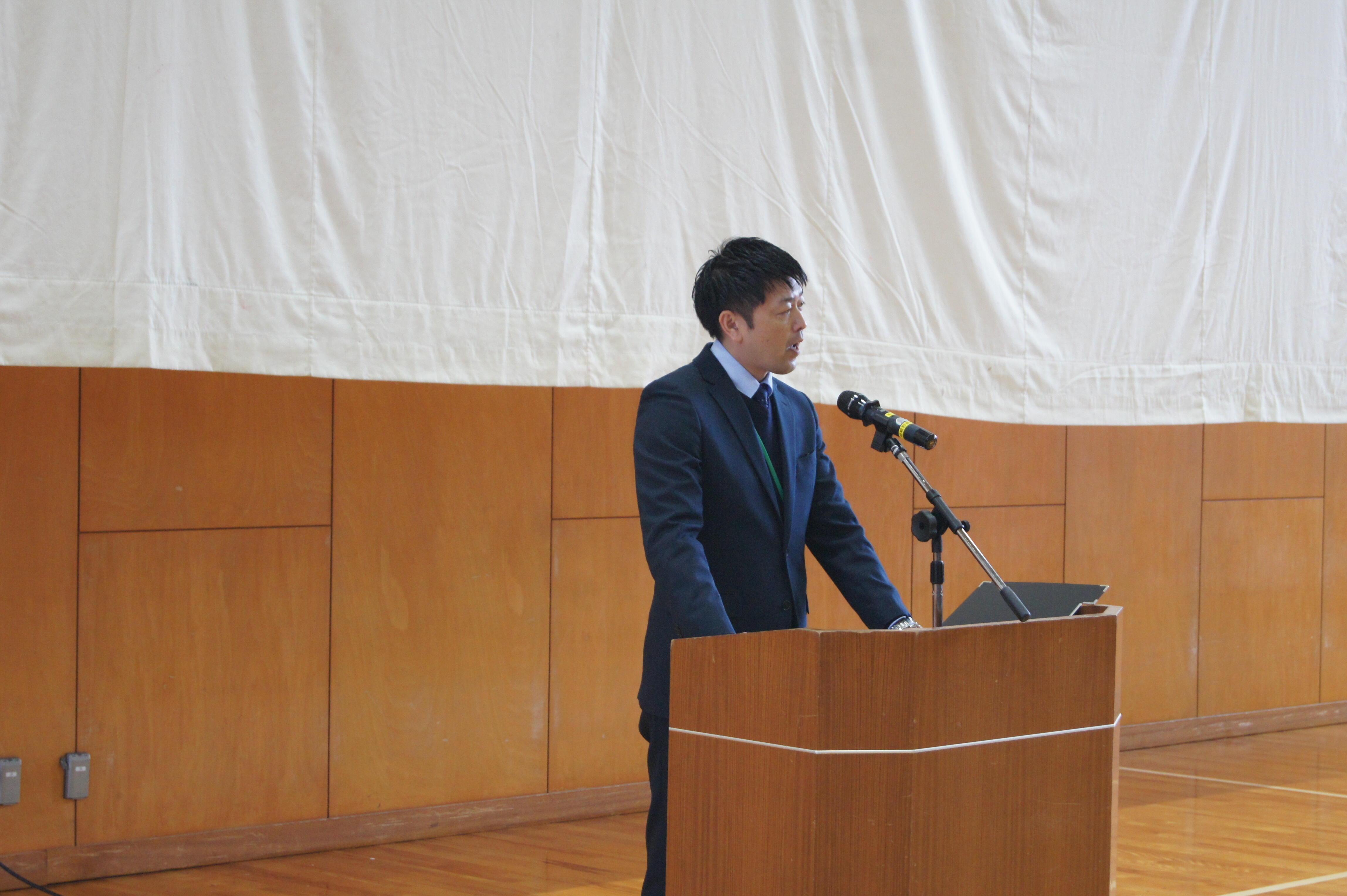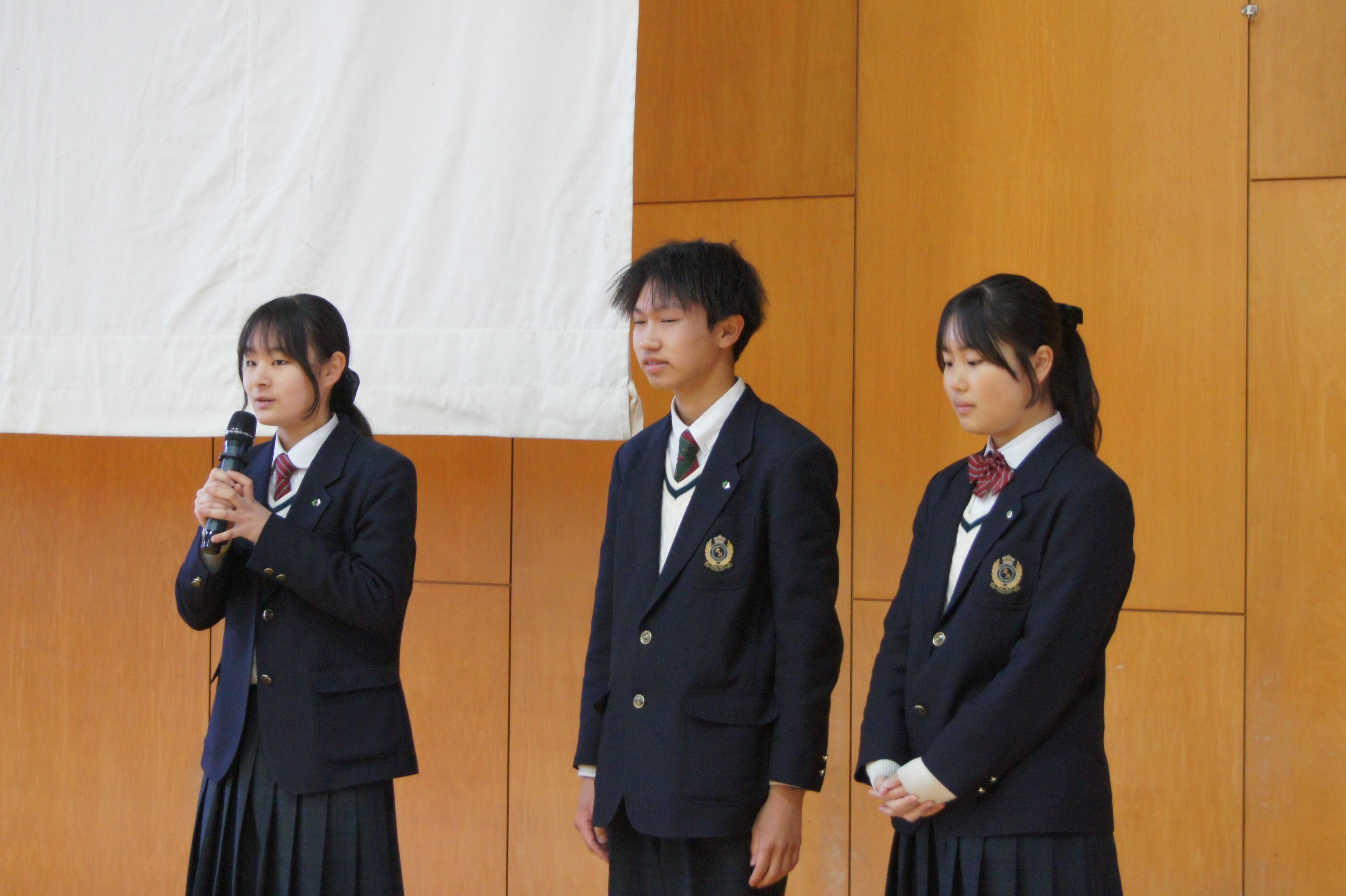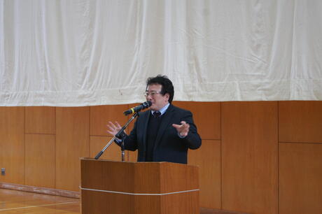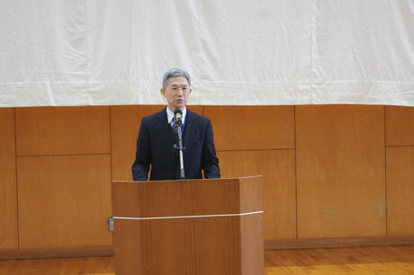各部活動の活躍やラボ活動では外部で成果を発表する生徒が増えたこと、生徒会活動の公約と成果について触れ、自分の言葉で説明することが「ほんまもん」の学びにつながっていく。待ちの姿勢では無く、自ら行動を起こす1年にしてほしい。