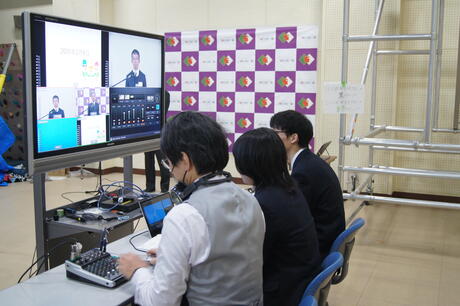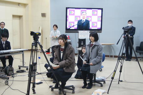 放送部のみなさんの協力で、スタジオからLIVE映像を各HR教室に配信しています。