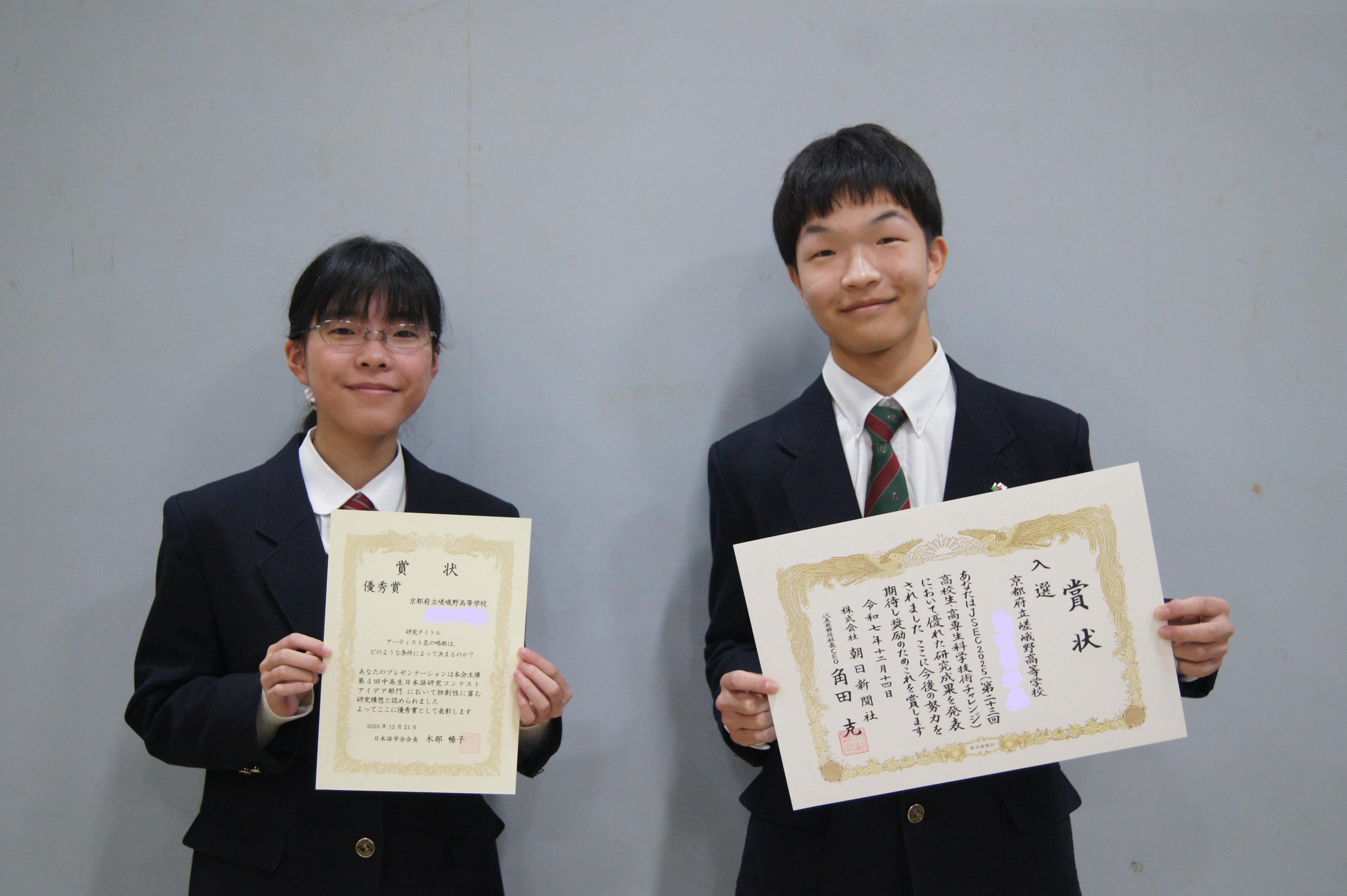 中高生日本語研究コンテスト アイデア部門において、アカデミックラボ「言語文化ラボ」の生徒が優秀賞を、高校生・高専生科学技術チャレンジJSEC2025において、スーパーサイエンスラボ「数学ラボ」の生徒が入賞しました。