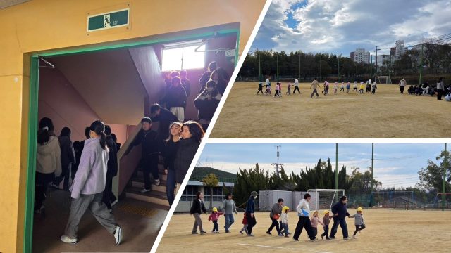 1月13日(火)、地震の発生を想定した避難訓練を実施いたしました。今回は、隣接する幼稚園とも連携し、合同での避難を行いました。