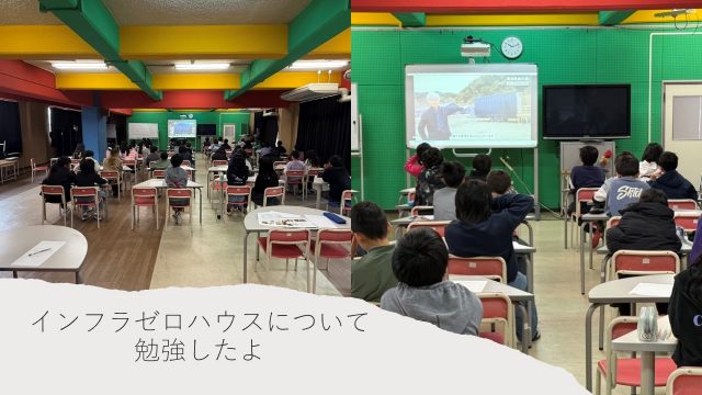 見学に先立ち、本校では八幡市教育委員会の川中尚教育長をお招きし、特別出前授業を行っていただきました。「インフラとは何か?」「インフラゼロハウスの仕組みとは?」といった基礎知識から、「自分たちならどう活用したいか」というアイデアまで、見学をより深めるための貴重なお話を聞くことができました。