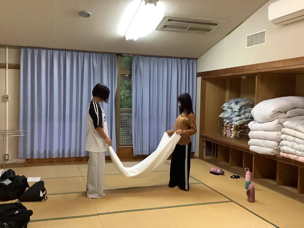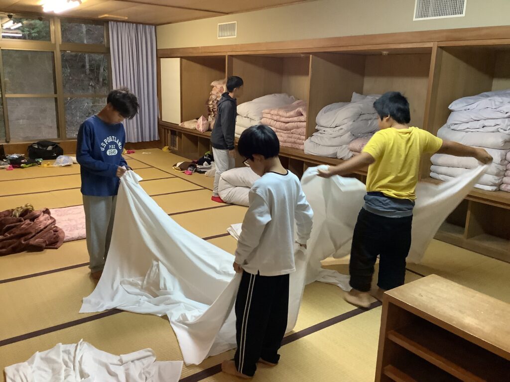 昨日の夜はぐっすりと眠れた子どもたち。様子を見にいくと、ここでも協力する様子が。シーツや布団をたたむ際に声をかけ合っていました。