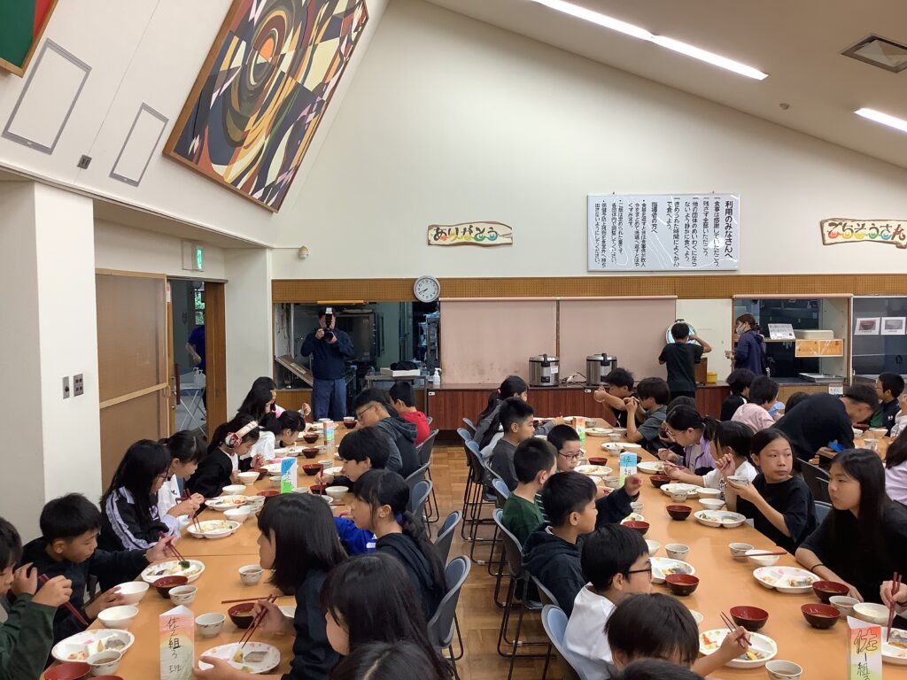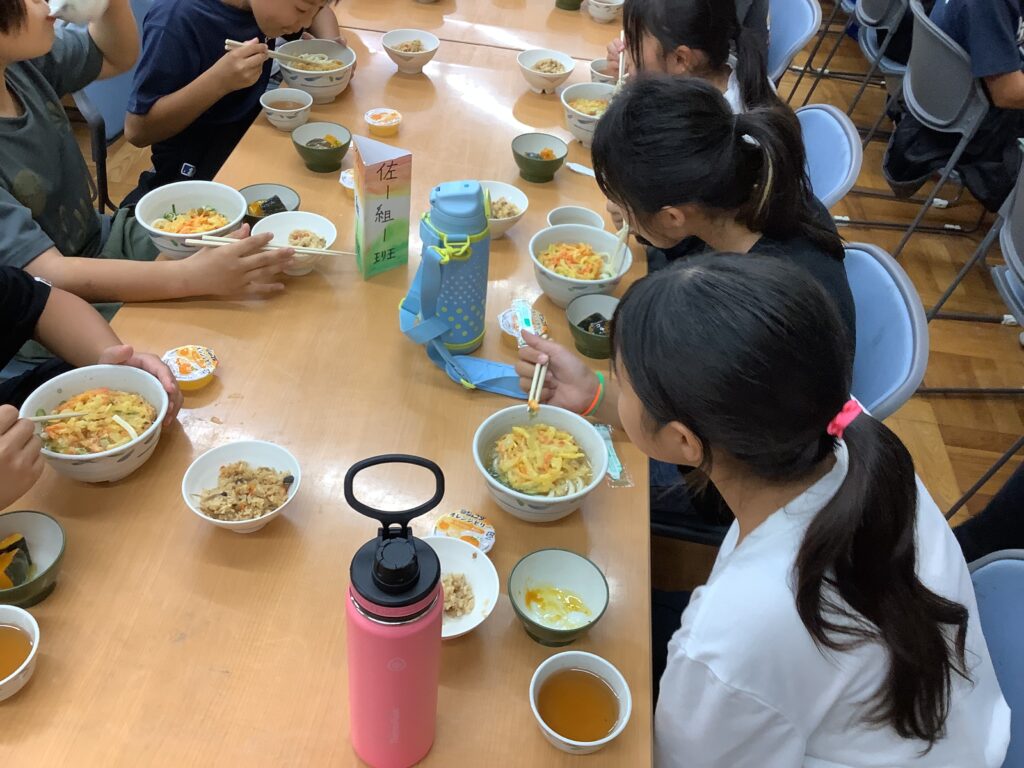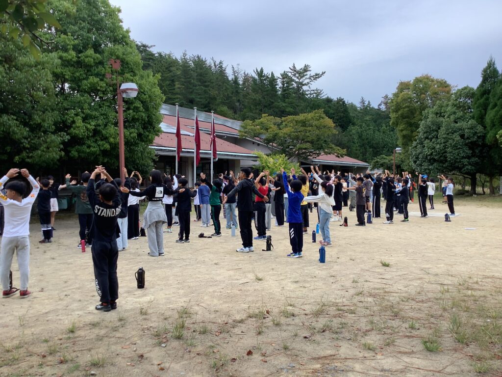 3小学校合同で、朝の集いを行ないました。ラジオ体操でしっかり目を覚ましました。朝の集いの後は、朝食タイム。昨日の夕食が早かったので、お腹も空いていたようで、みんなしっかり食べました。
