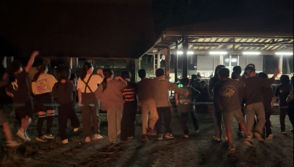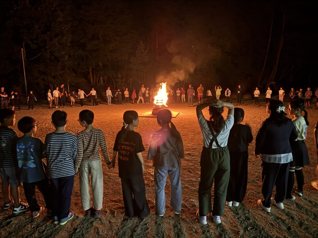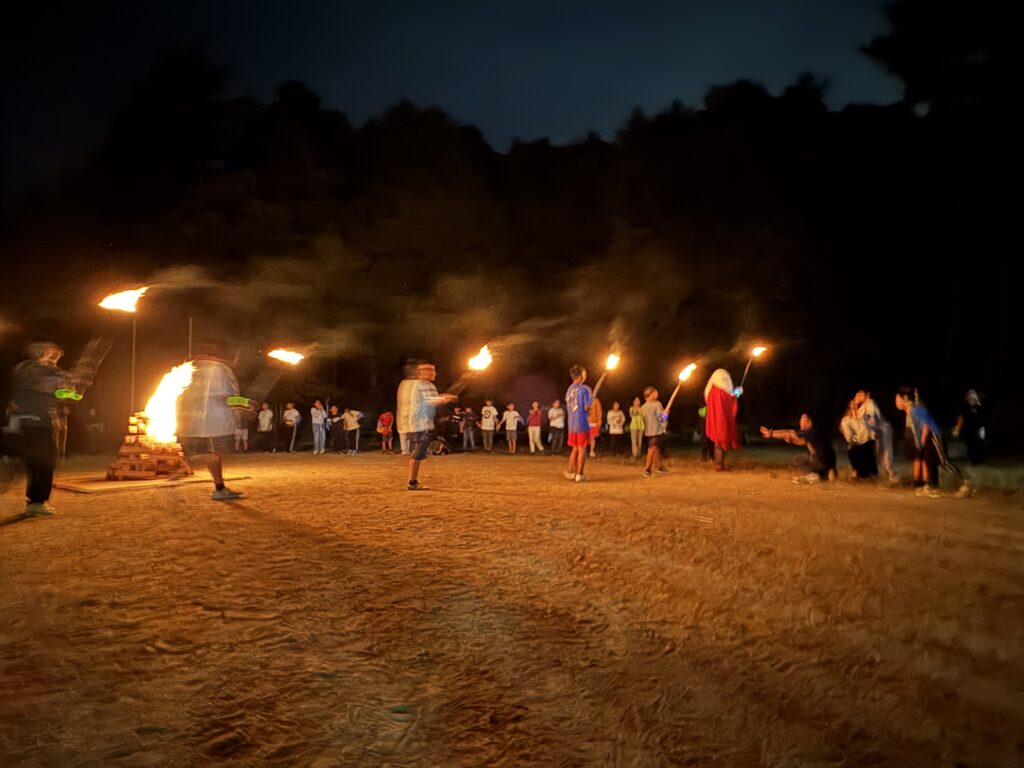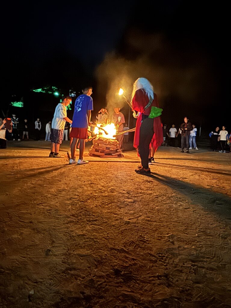林間学習1日目の締めくくりは、みんなが楽しみにしていたキャンプファイヤーです。火の子たちが、山の神からありがたい言葉とともに神聖な火をもらい中央に火を灯しキャンプファイヤーがスタートしました。歌って、踊って、ゲームやダンスを楽しみ大盛り上がりのキャンプファイヤーとなりました。