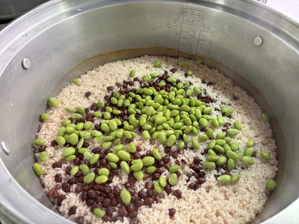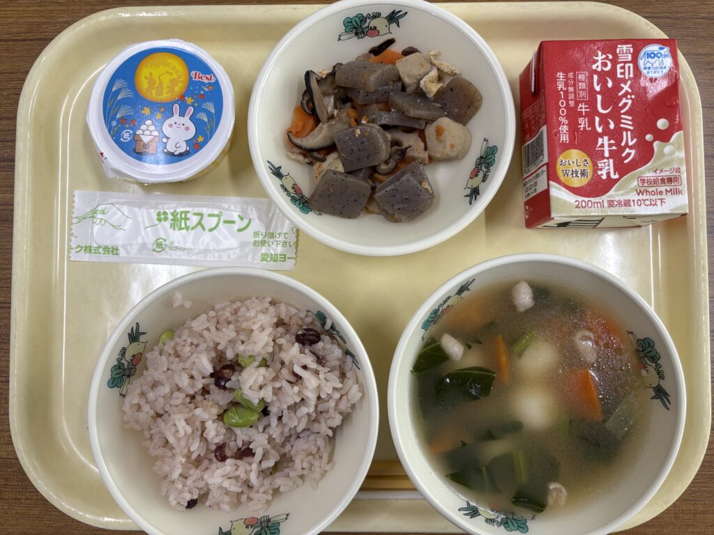中秋の名月は、1年でもっとも月がきれいに見える日と言われています。中秋の名月には、秋の豊作を願ってお月見団子や里芋などをお供えします。給食では、今が見頃の萩の花に見立てた萩ご飯もあわせていただきます。