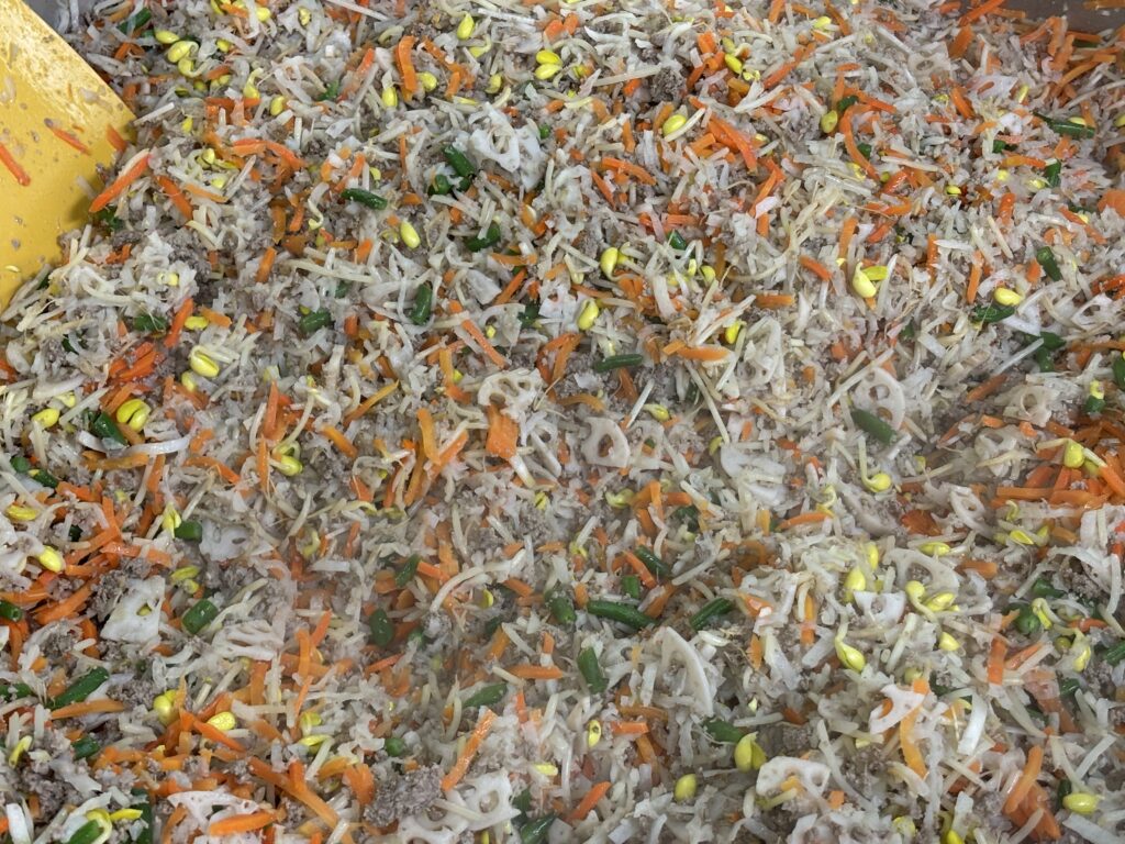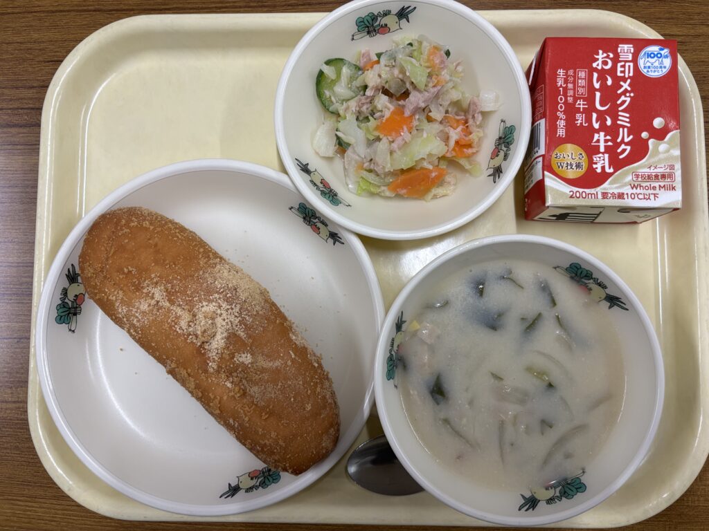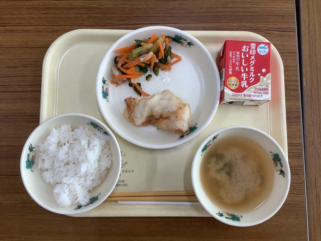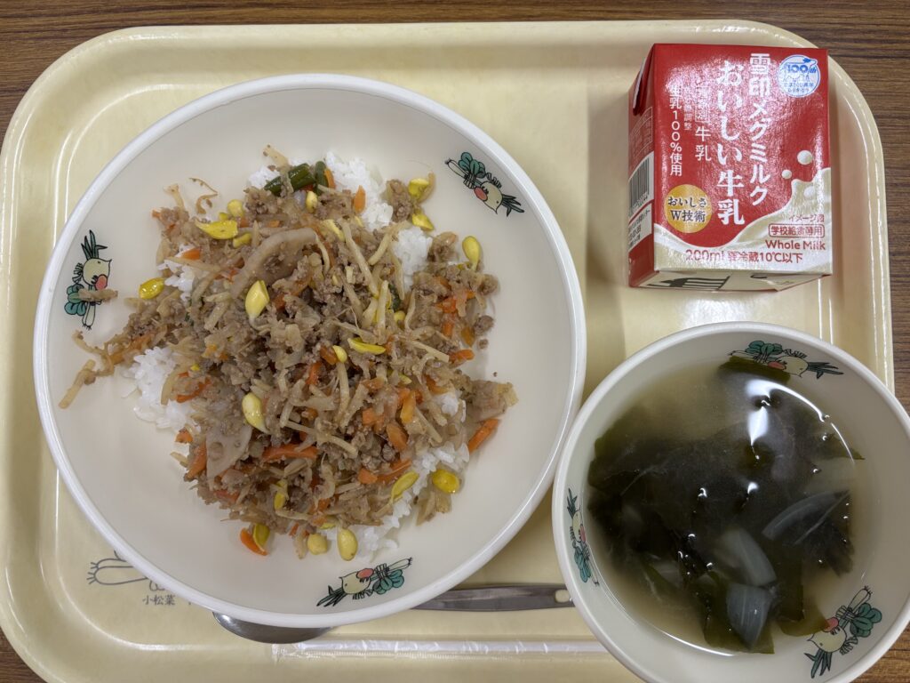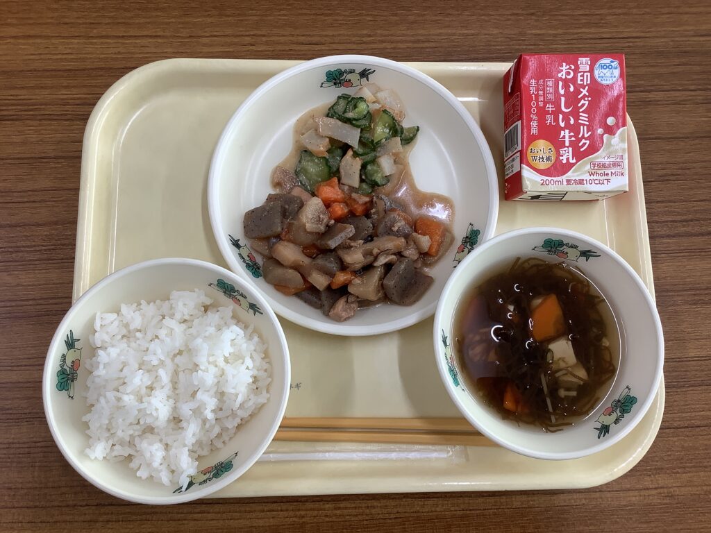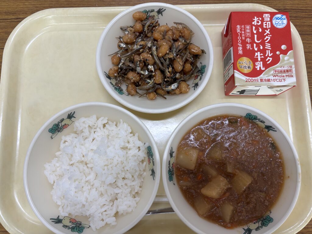いい歯の日に合わせて、かみかみ献立が登場です。小さいおかずに入っている魚は、「かえりちりめん」といいます。骨ごと食べられるので、じょうぶな歯に欠かせないカルシウムをたっぷりとることができます。よくかんで食べましょう!