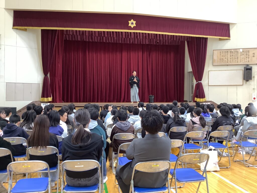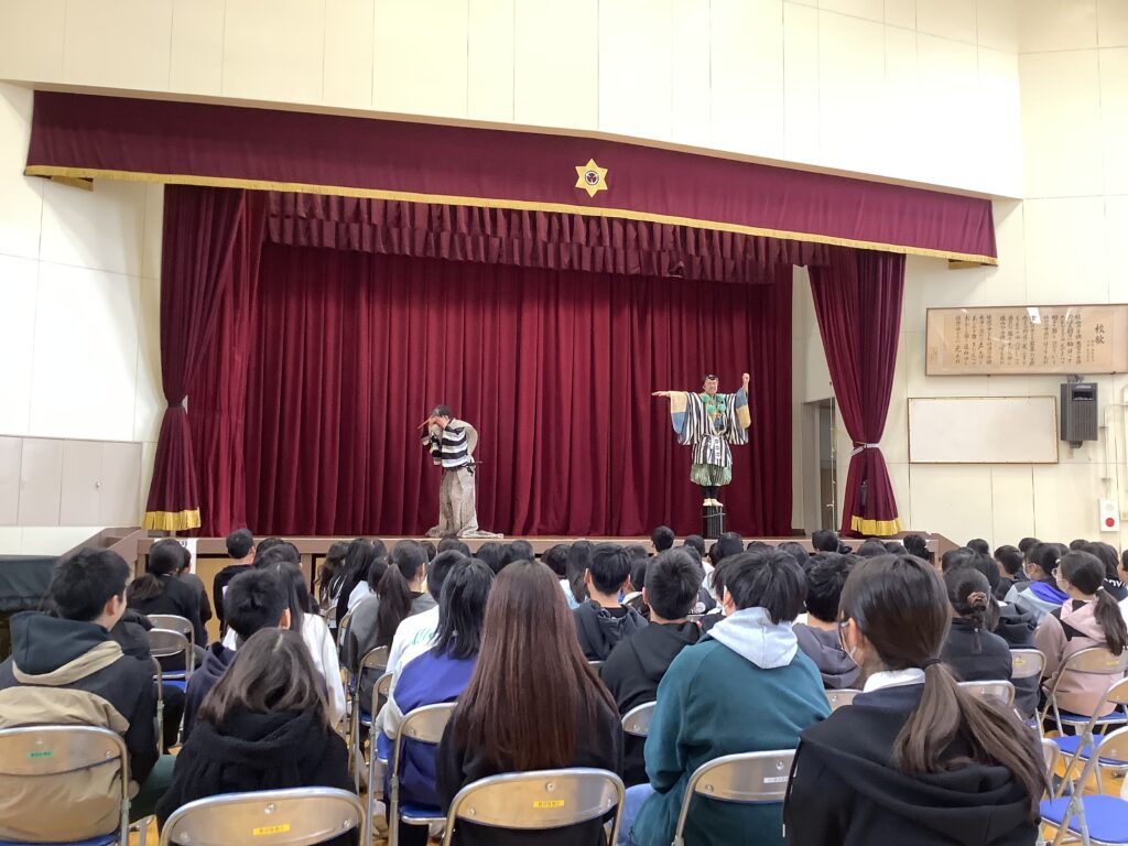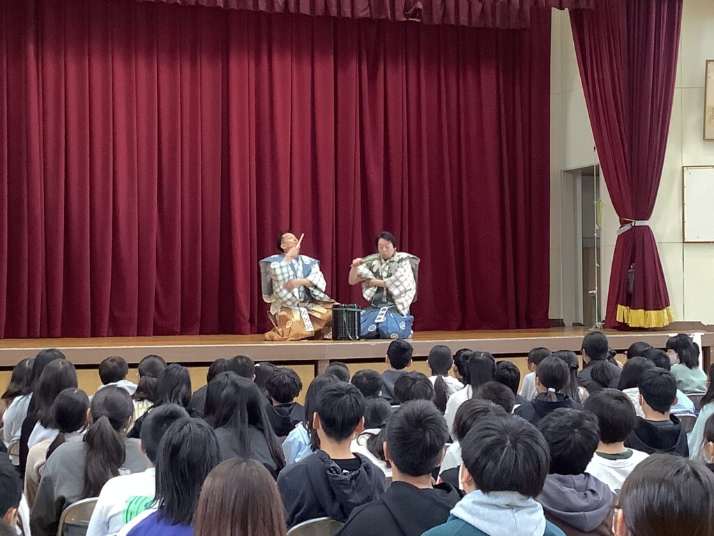 6年生の国語科には、狂言「柿山伏」を楽しむ学習があります。狂言の題材は「柿山伏」と「附子」です。柿山伏は国語の教科書にも載っている内容です。演目の前には、子どもたちにも分かるように講師の方から説明も入れていただきました。狂言に触れる機会がない子どもたちがほとんどなので、日本の伝統文化を肌で感じる良い機会となりました。