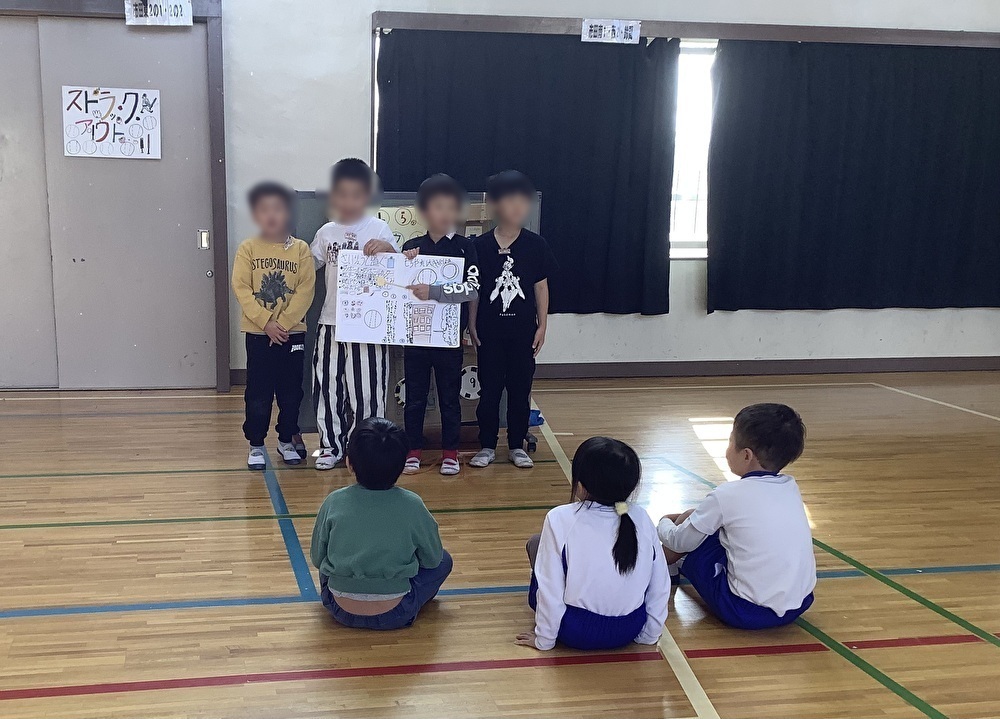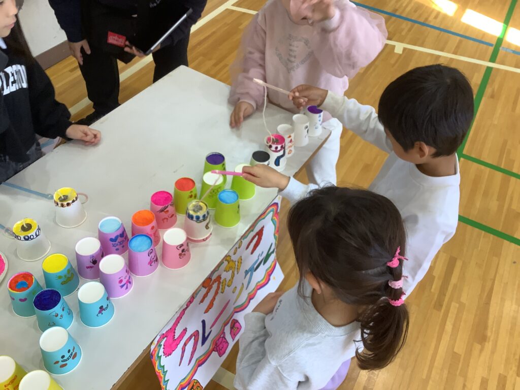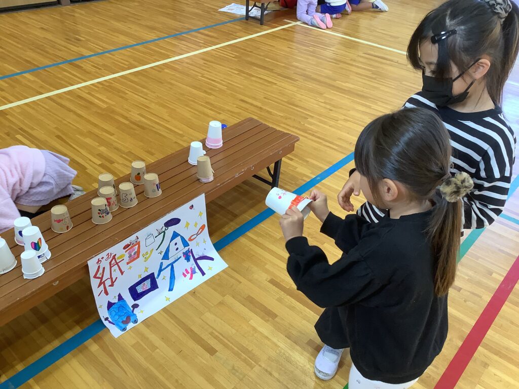 2年生のこどもたちがこども園の年長さんを招待し、おもちゃ祭りを開催しました。2年生は今日までの間に、生活科の学習で年長さんが楽しめるようなおもちゃを工夫して作りました。また国語科で学習した分かりやすい説明の仕方を意識し、おもちゃの作り方を年長さんに説明していました。2年生も年長さんもとても楽しそうで、笑顔がたくさん見られました。