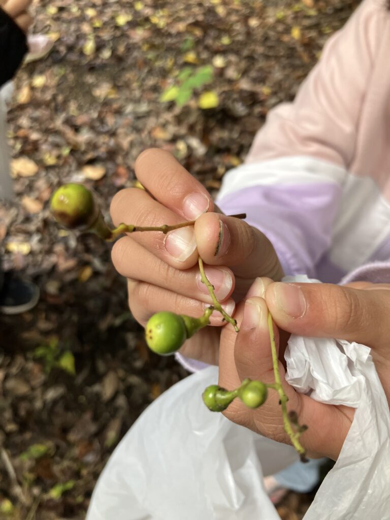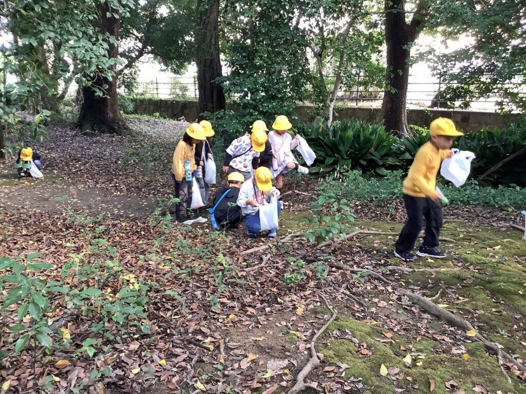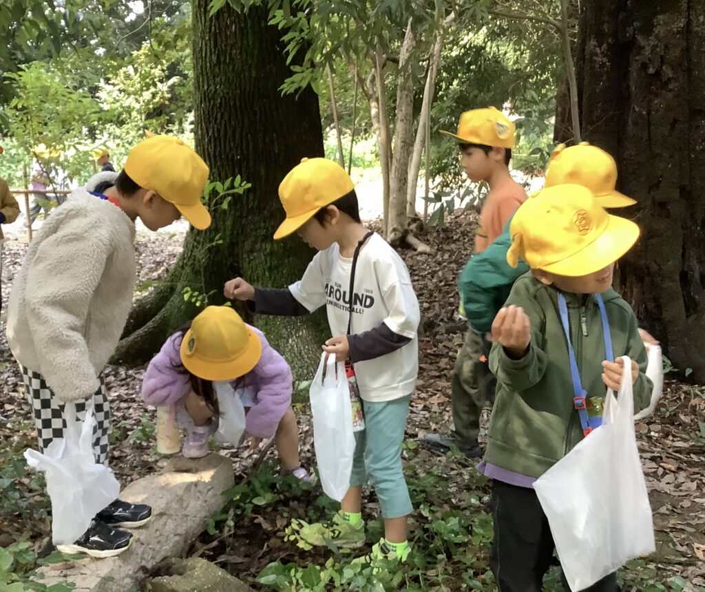 今日、雙栗神社に秋みつけに行ってきました。1年生の子どもたちは、歩きながら木々が色付いている様子を見たり、ドングリや葉っぱを拾ったりしてたくさんの秋を見つけることができました。また、拾った木の実を友達と見せ合ったり、落ち葉の形や色を比べたりしながら、楽しく活動しました。