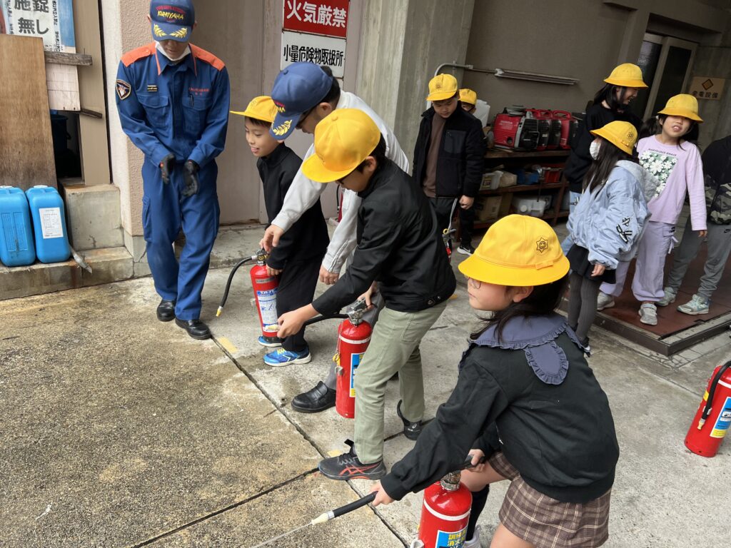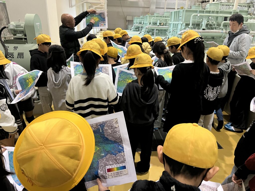 社会科の学習の一環で、3年生の子どもたちが役場、消防署、排水機場の見学に行きました。役場では、建設中の施設について話を聞いたり、クイズをしたりして自分たちの住んでいる町についての理解を深めました。消防署では、消化器体験、救急救命体験、通信司令室の見学などをさせてもらいました。その後、浸水被害を軽減する役割を担っている、排水機場の仕組みについて学びました。