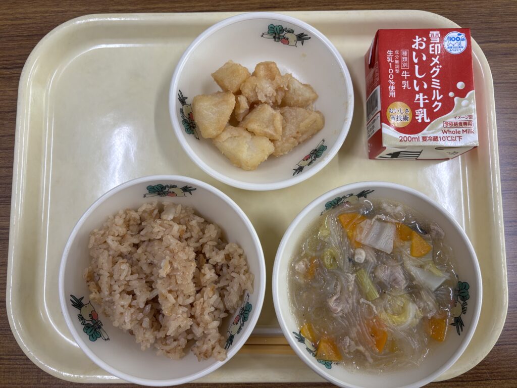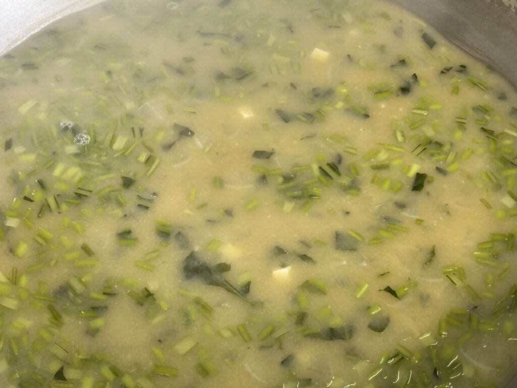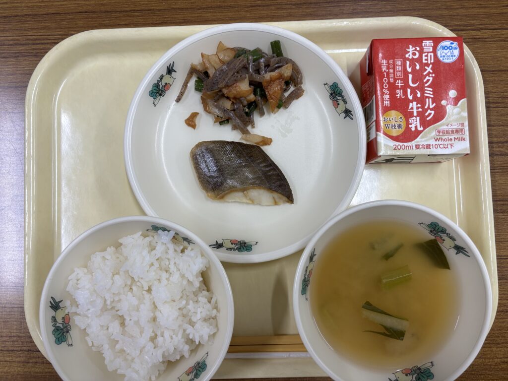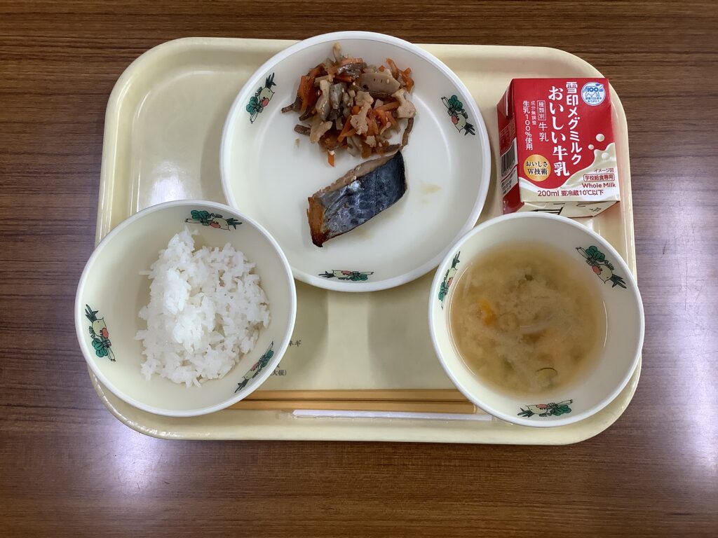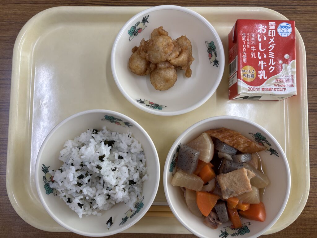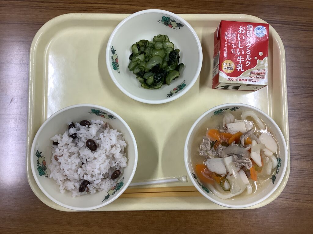 今日のみそ汁は、5年1組でグランプリに輝いたみそ汁です。小松菜、大根、さつま芋、豆腐、久御山みそを使用しています。煮干しでしっかりとだしをとって作りました。赤・黄・緑の食品をとることが出来る栄養満点のみそ汁です。