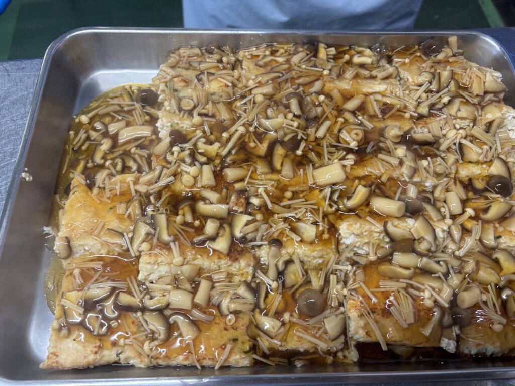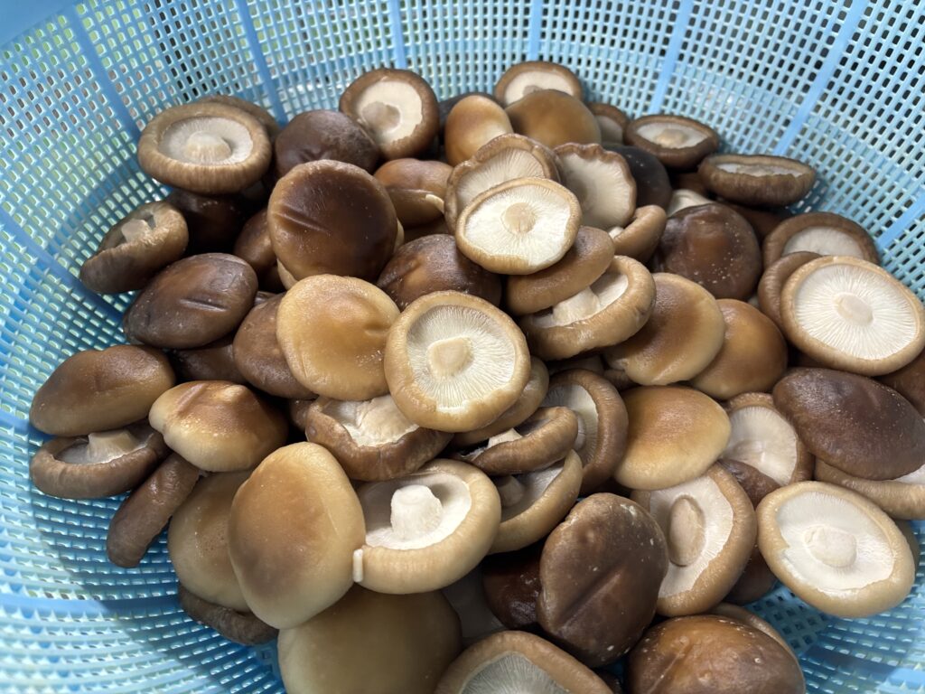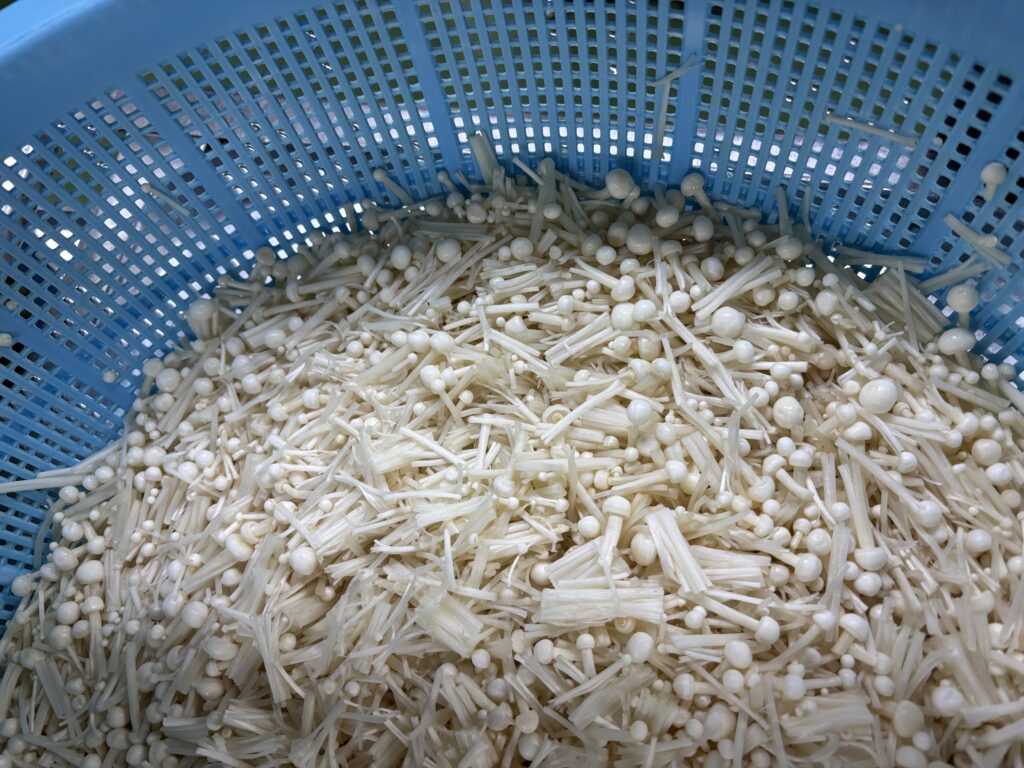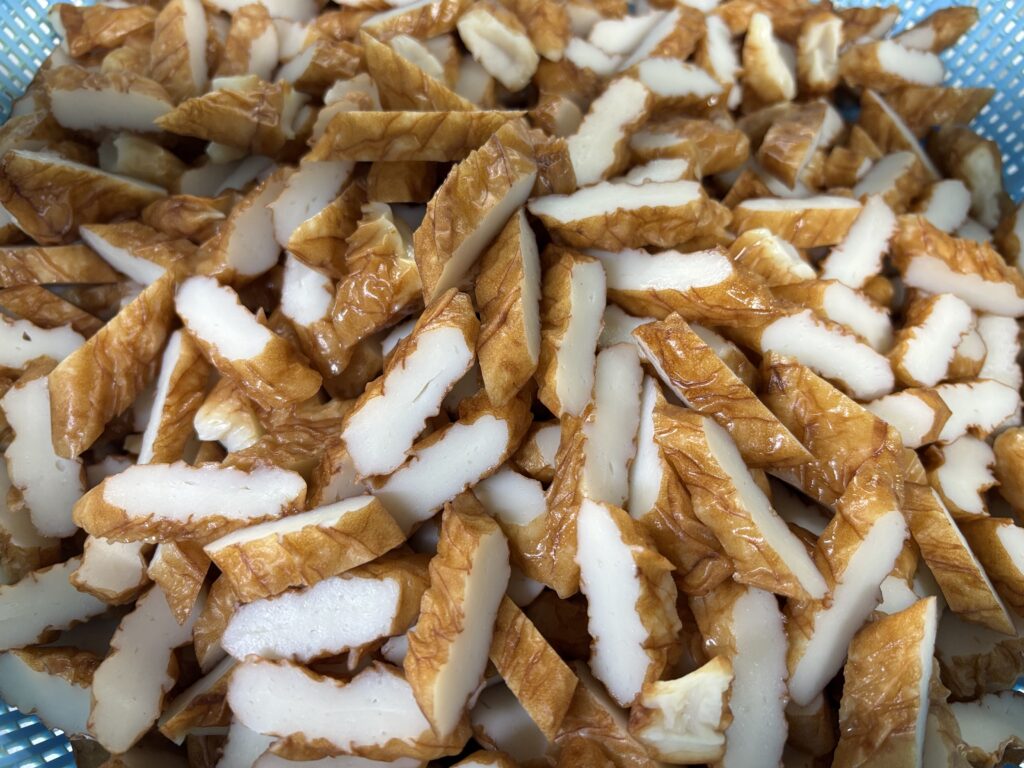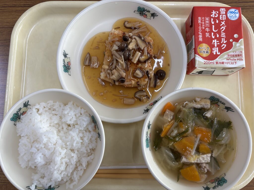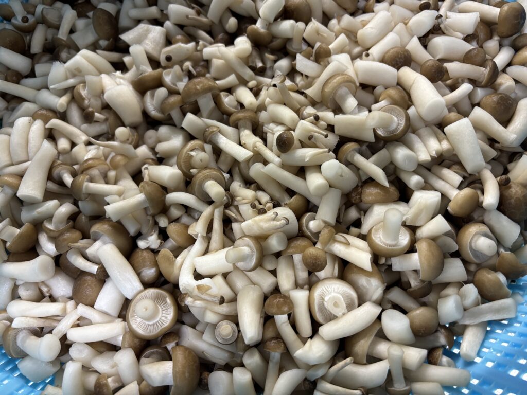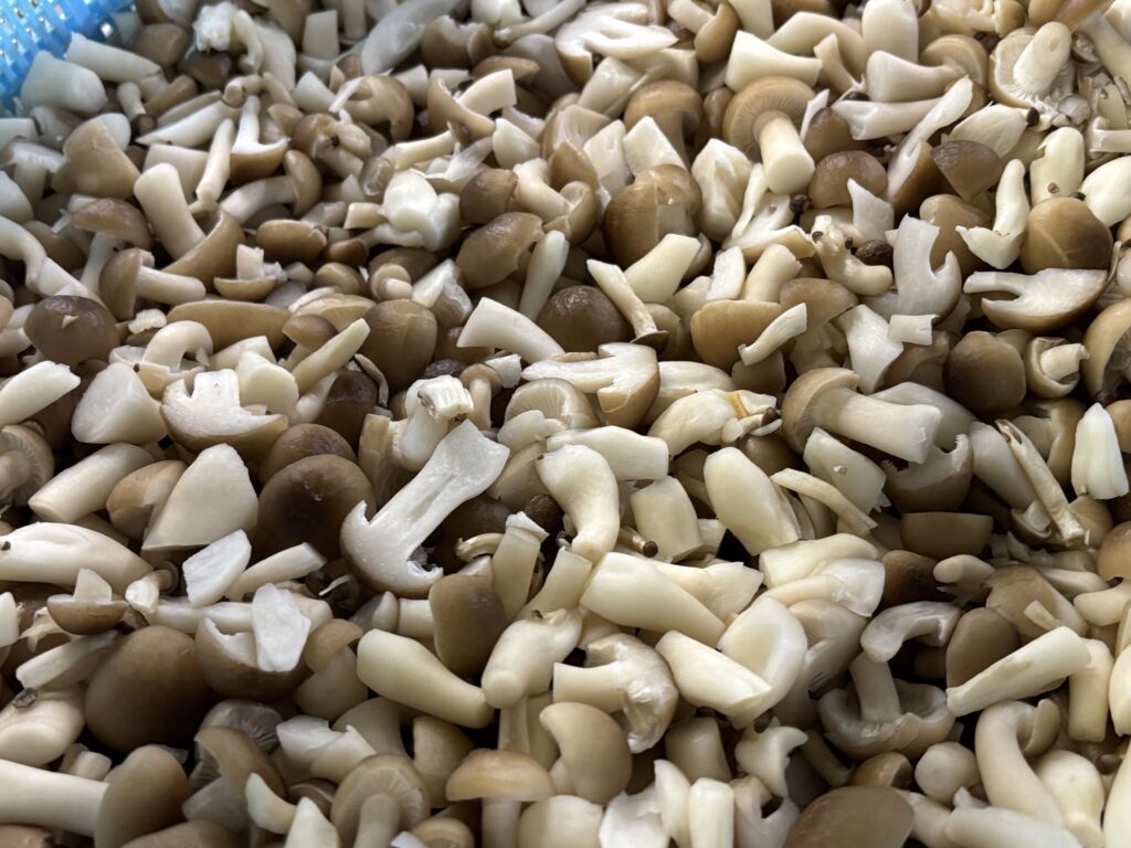今日の豆腐ハンバーグきのこあんかけには、3種類のきのこが入っています。丸くて大きな「かさ」があるものがしめじ、薄切りにされたうま味が強いものがしいたけ、白くて細いものがえのきだけです。