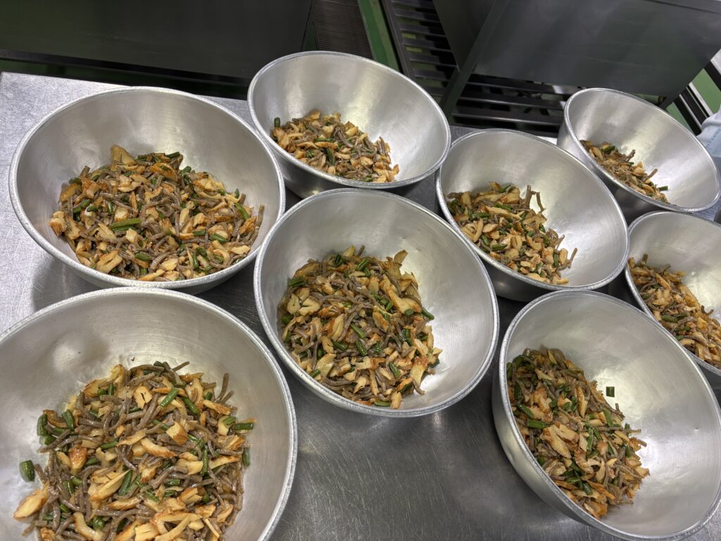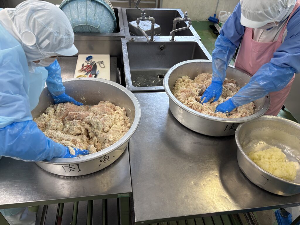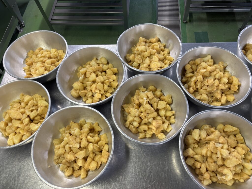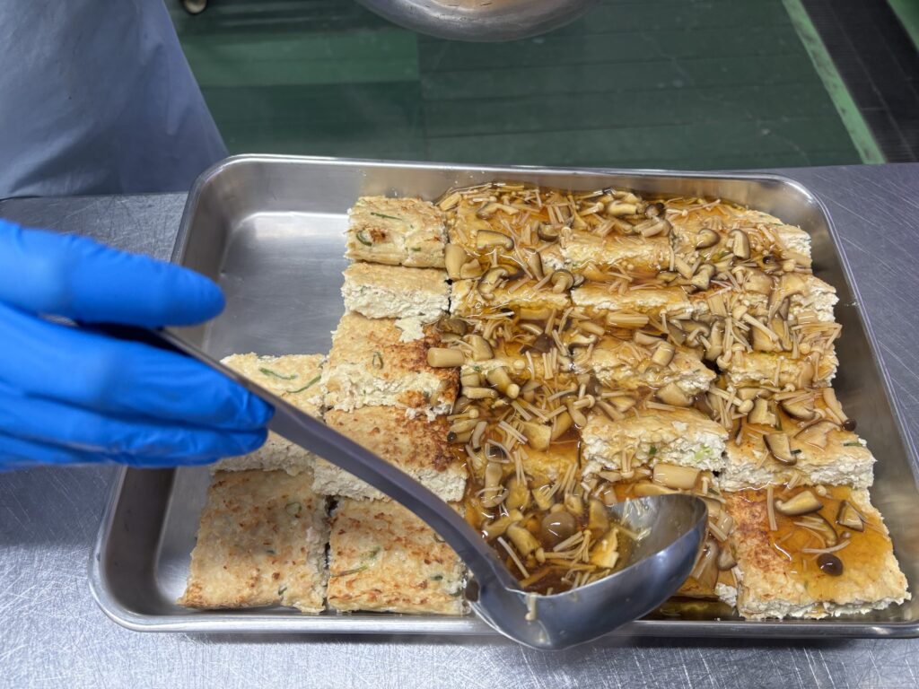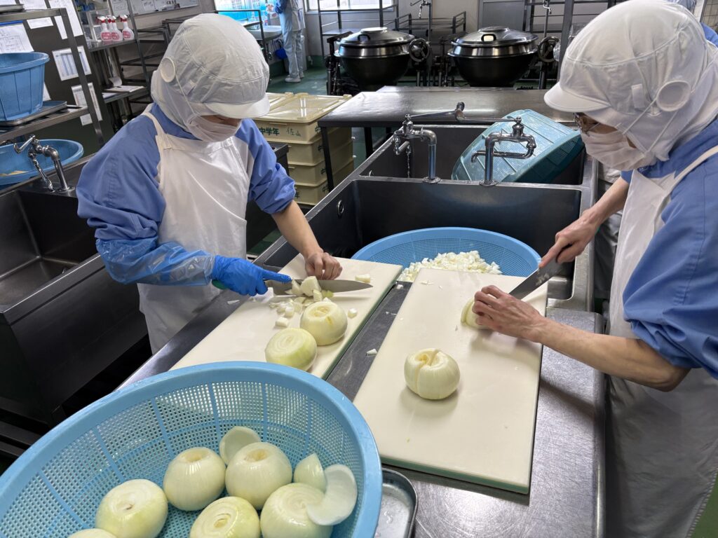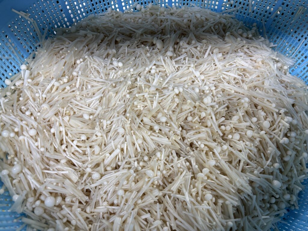 今日の豆腐ハンバーグきのこあんかけには、3種類のきのこが入っています。丸くて大きな「かさ」があるものがしめじ、薄切りにされたうま味が強いものがしいたけ、白くて細いものがえのきだけです。
