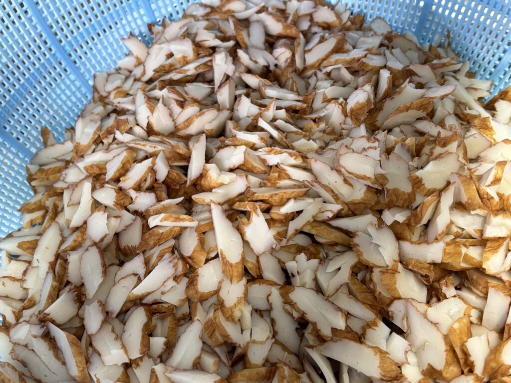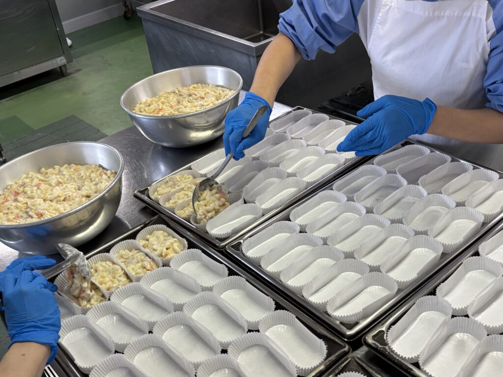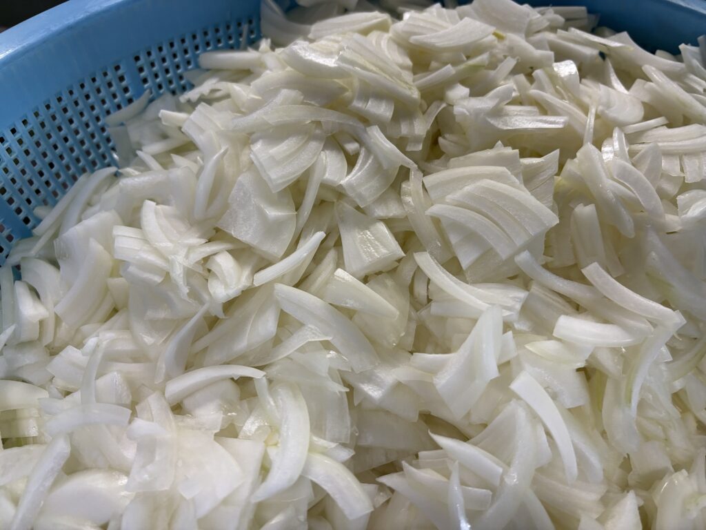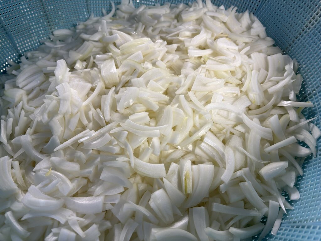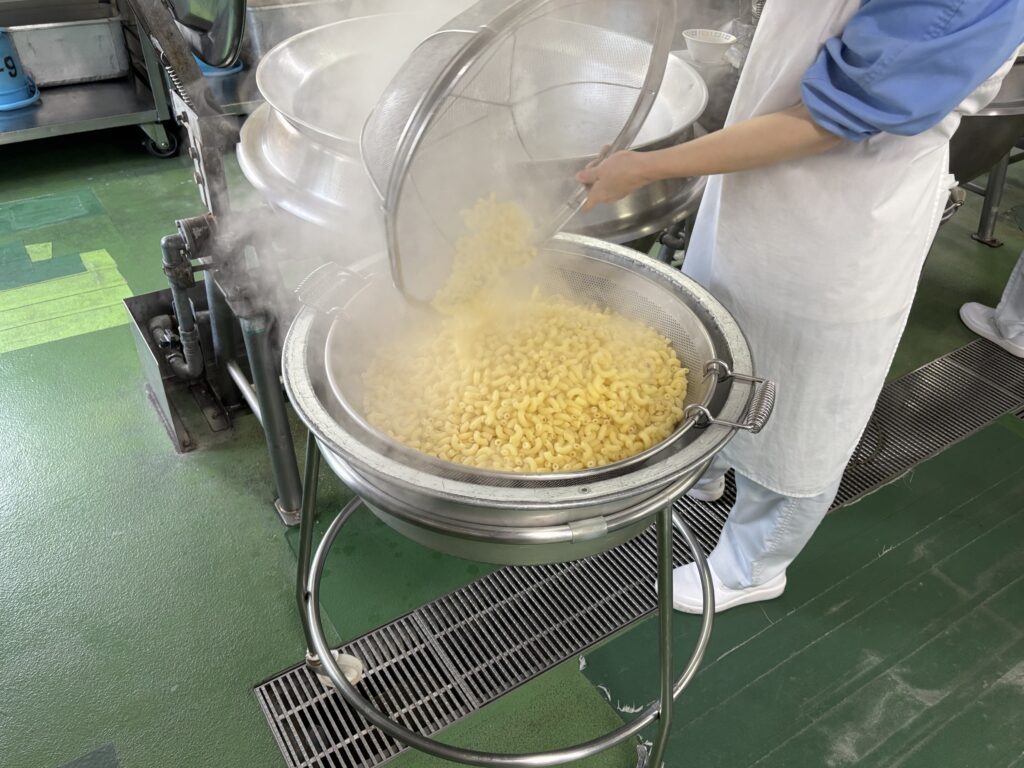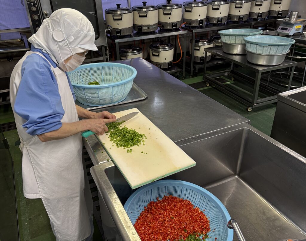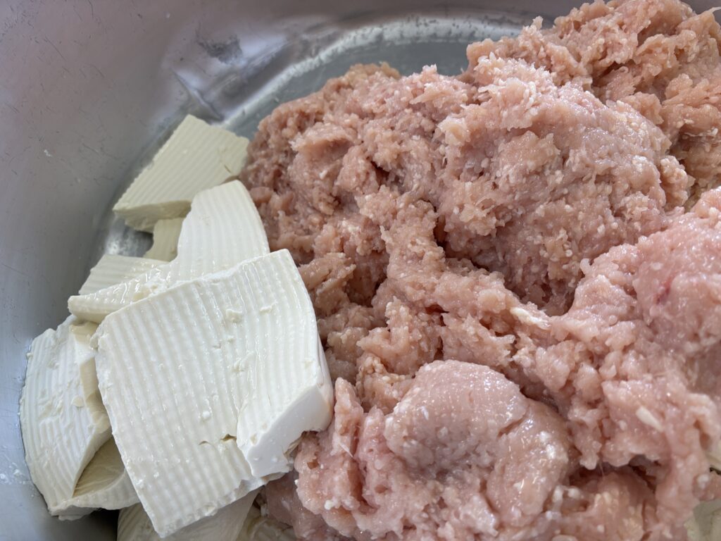 今日の豆腐ハンバーグきのこあんかけには、3種類のきのこが入っています。丸くて大きな「かさ」があるものがしめじ、薄切りにされたうま味が強いものがしいたけ、白くて細いものがえのきだけです。