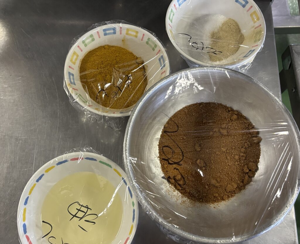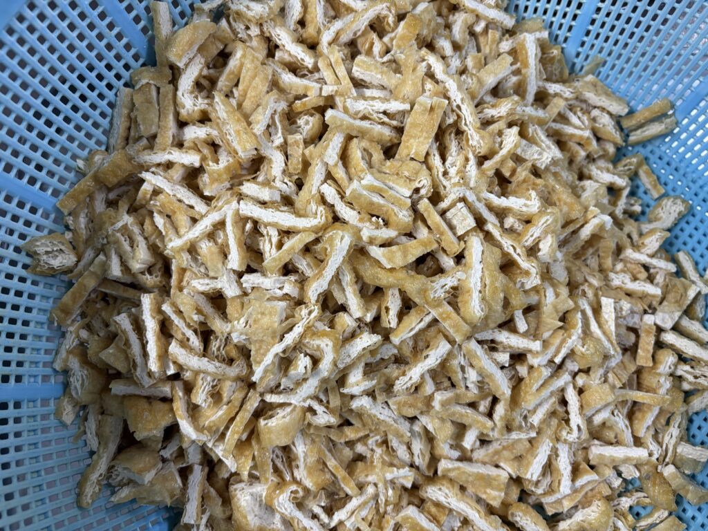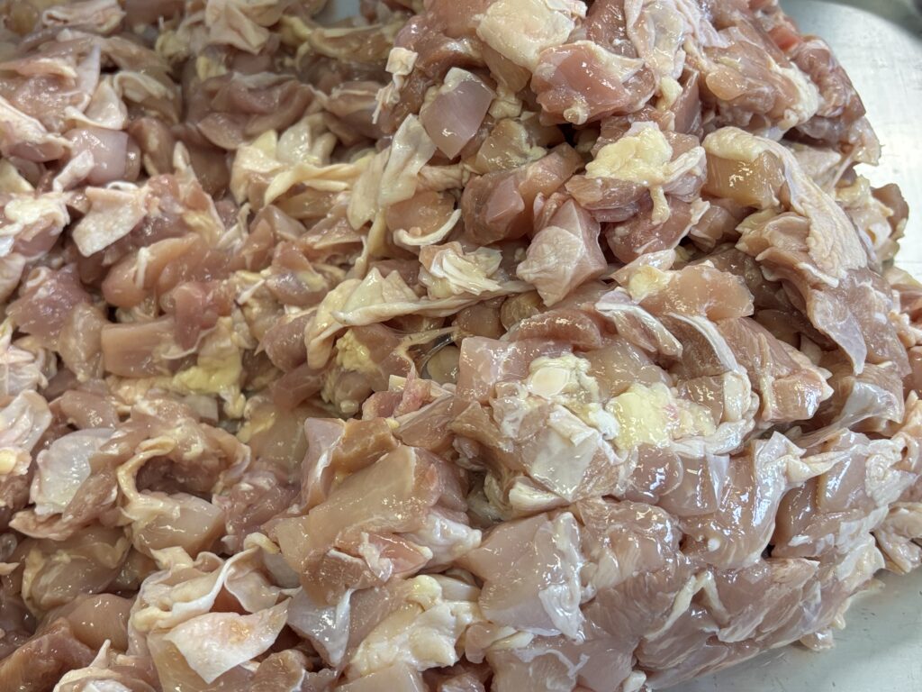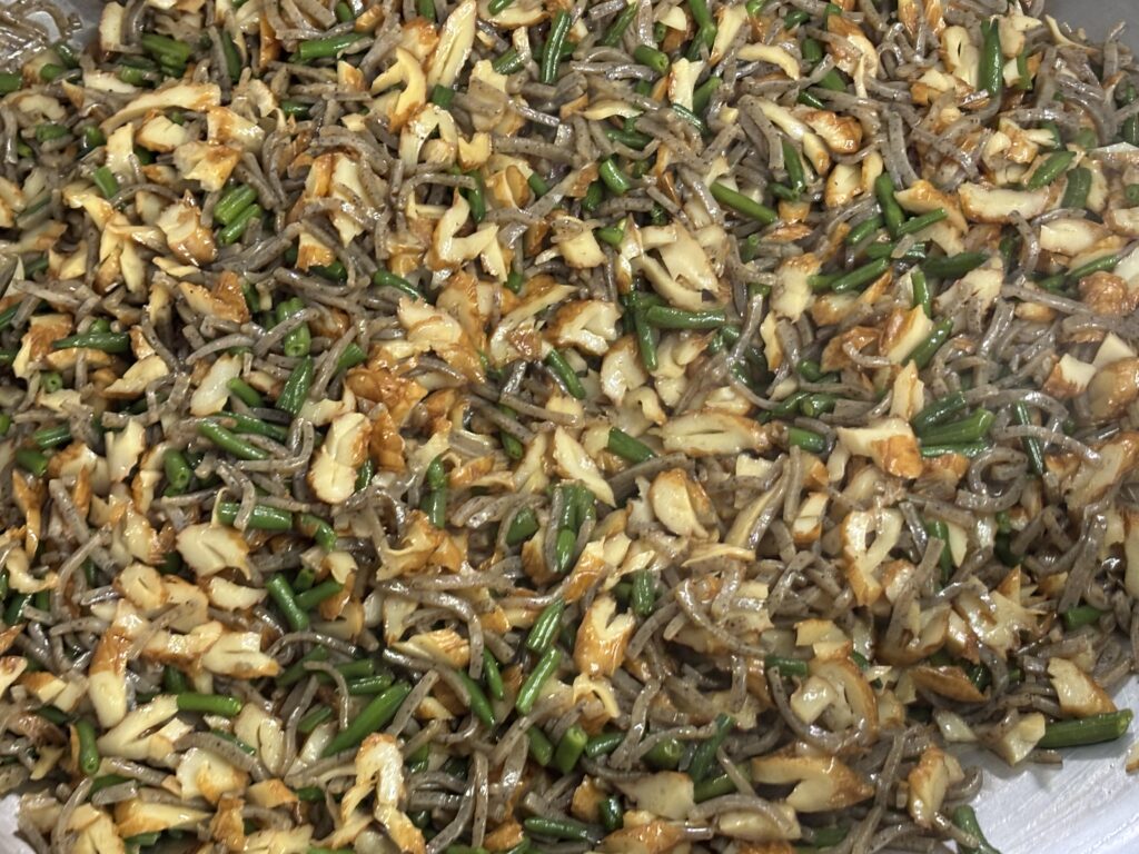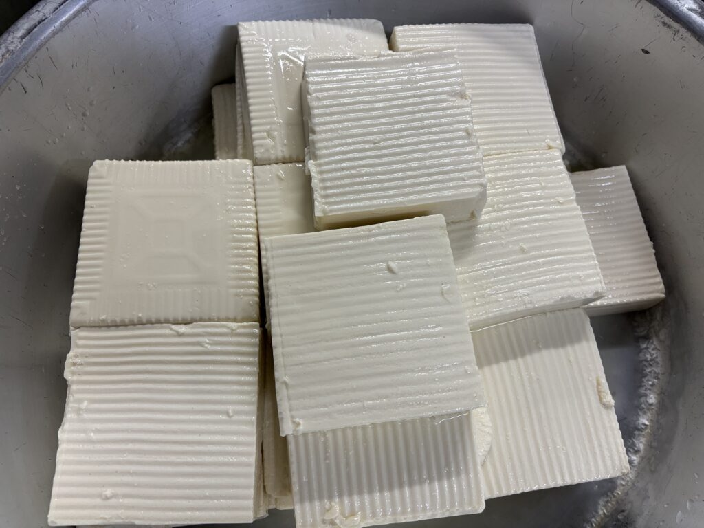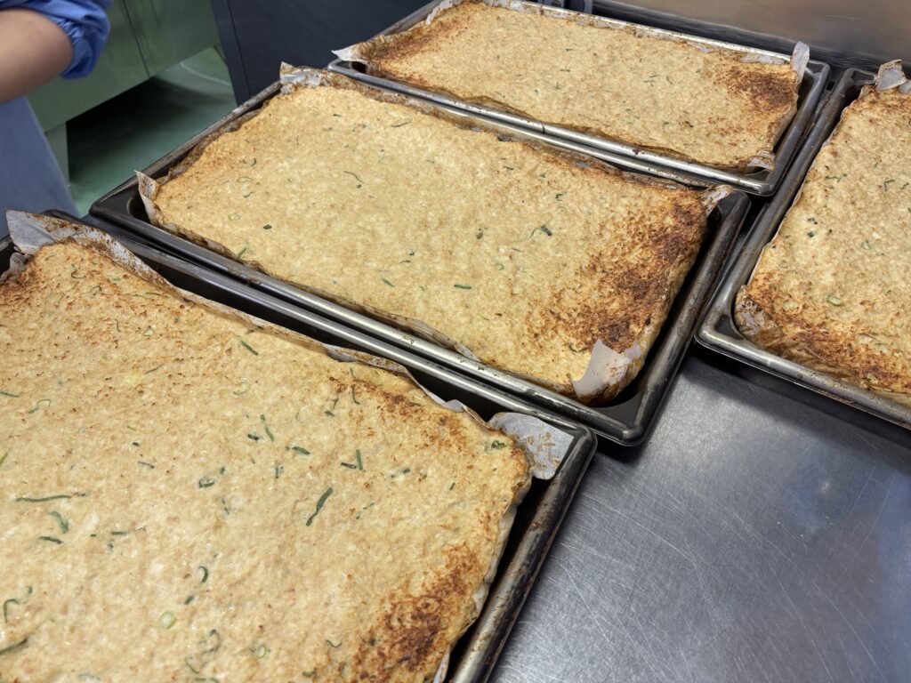 今日の豆腐ハンバーグきのこあんかけには、3種類のきのこが入っています。丸くて大きな「かさ」があるものがしめじ、薄切りにされたうま味が強いものがしいたけ、白くて細いものがえのきだけです。