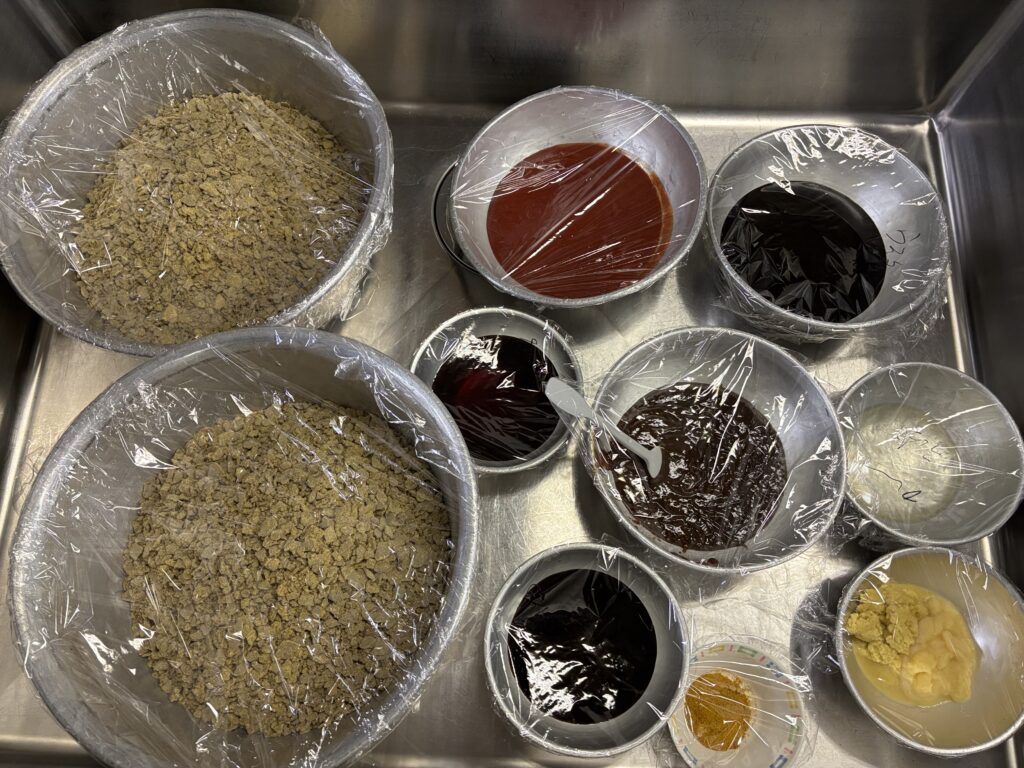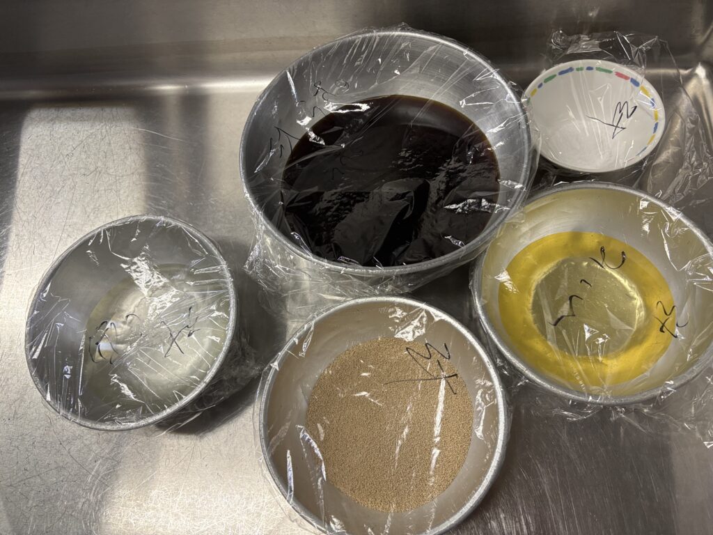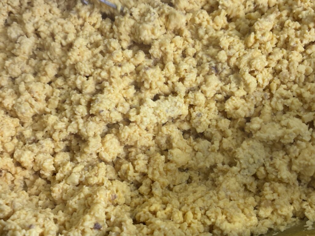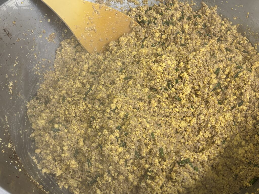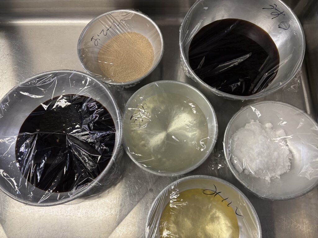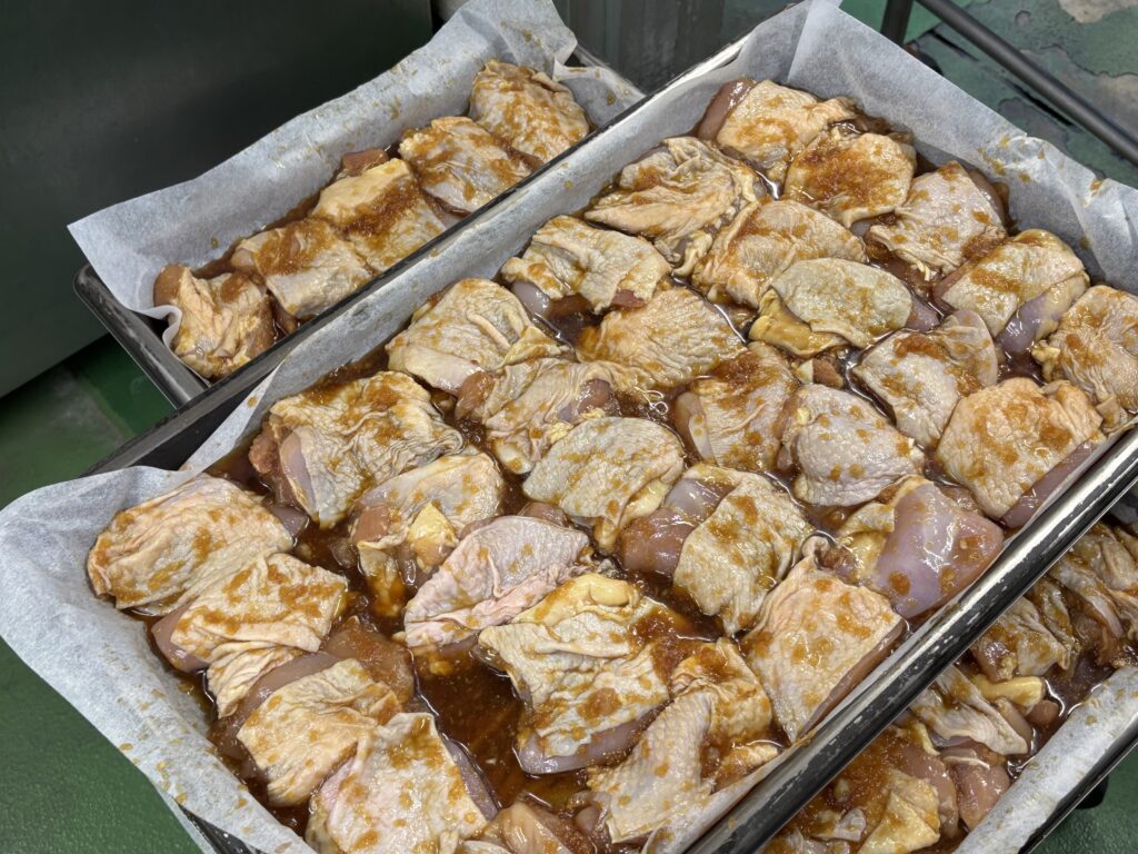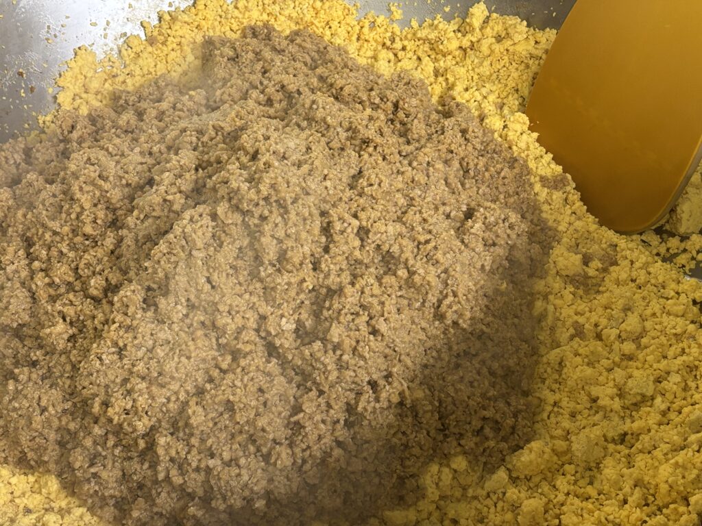 今日の豆腐ハンバーグきのこあんかけには、3種類のきのこが入っています。丸くて大きな「かさ」があるものがしめじ、薄切りにされたうま味が強いものがしいたけ、白くて細いものがえのきだけです。