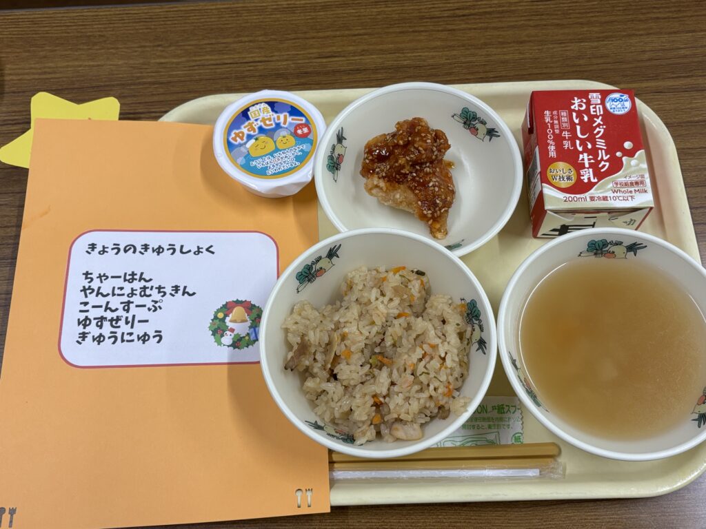 冬至は一年のうち、もっとも昼が短く、もっとも夜が長い日です。この日に「ん」がつく食べ物を食べると、運が呼び込めると言われています。今日の給食にも4つ入っています。探してみてね!