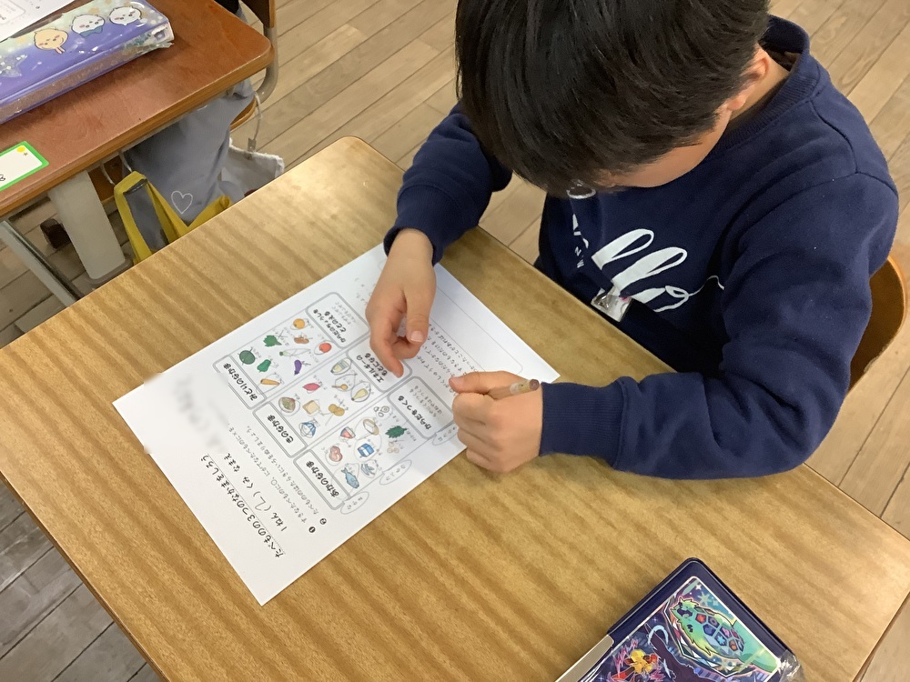 給食感謝週間の期間に町内の栄養教諭に来ていただき、食育の授業をしていただきました。1年生は、食べ物は赤のグループ、黄のグループ、緑のグループに分かれていて、それぞれに役割があることを教えてもらいました。好きな食べ物、苦手な食べ物があるけれど、どの食べ物も体に必要だと学習し、苦手な食べ物でも少しずつ食べられると良いねということを確かめした。