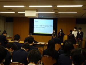 3年 地域貢献プロジェクト 令和7年度・学校生活の様子 2025.12.25 12月22日に3年生が、3年間の地域貢献学習のまとめとして役場にて教育長をはじめ、役場の方々に課題解決に向けた発表会を行いました。役場の各課よりいただいた課題に対してアドバイスを受けながら班で考えました。「図書館の利用」「ふるさと納税」「救急車の適正利用」等、どの班も自分たちが暮らす精華町を改めて見つめ、何ができるのか真剣に考えました。今回の学びが、これからの生活や将来の地域づくりにつながってくれることを期待しています。 Post Views: 23