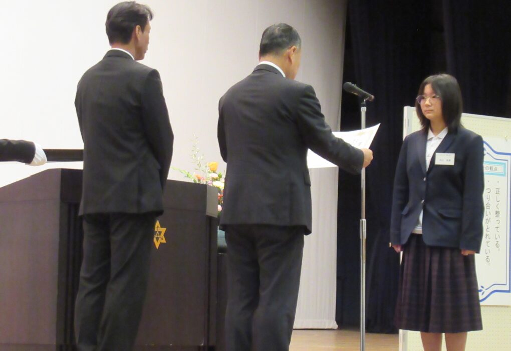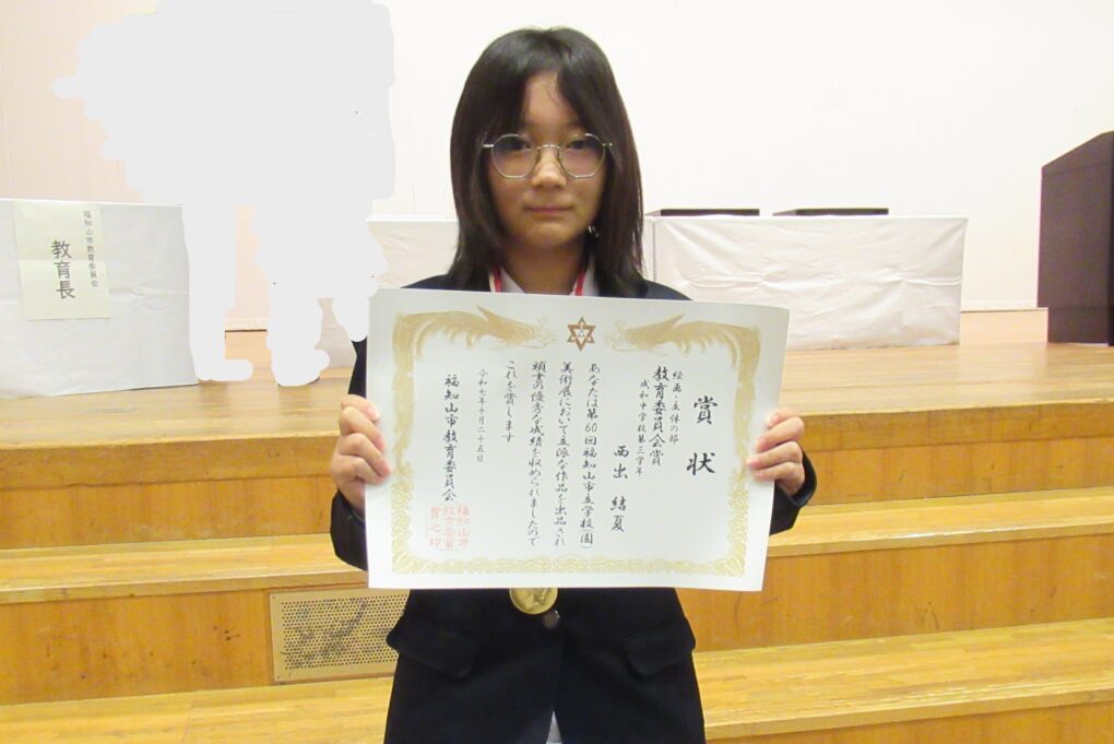 本日の成和中10月25日(土)福知山市立学校園美術展の表彰式が厚生会館で行われました。絵画・立体作品の部において本校3年生の西出結夏さんが昨年に続き、2年連続の「教育委員会賞」を受賞しました。「cut cat」というタイトルの作品で多くの人が感心して鑑賞されていました。