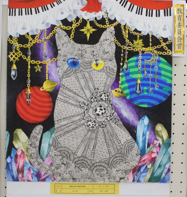 10月25日(土)福知山市立学校園美術展の表彰式が厚生会館で行われました。絵画・立体作品の部において本校3年生の西出結夏さんが昨年に続き、2年連続の「教育委員会賞」を受賞しました。「cut cat」というタイトルの作品で多くの人が感心して鑑賞されていました。