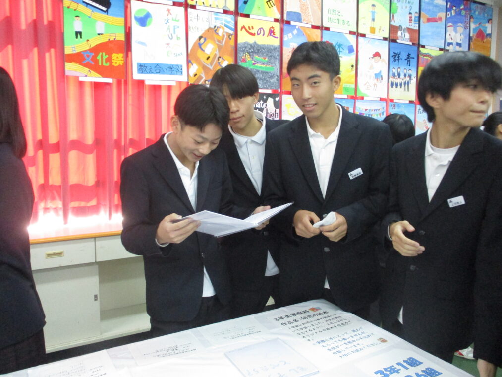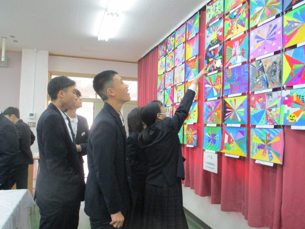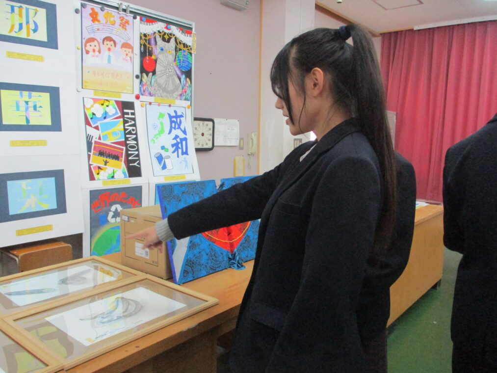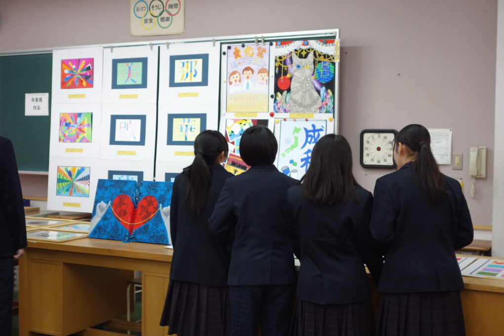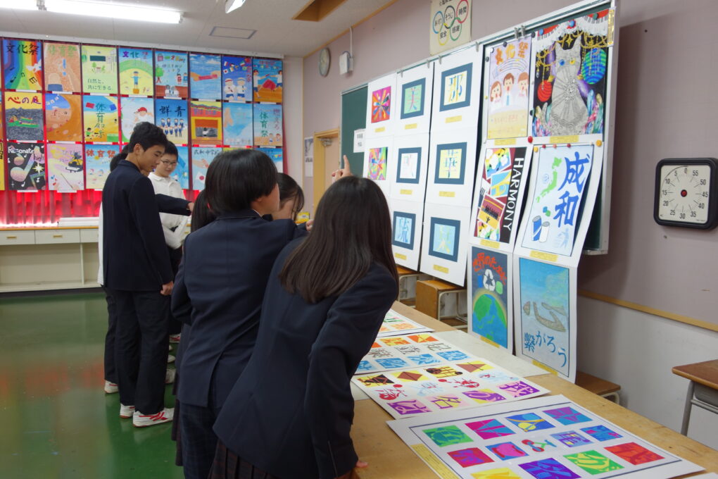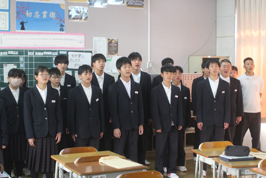 いよいよ第73回成和中学校文化祭の前日となりました。いままでたくさんの時間をかけ学級合唱の練習に取り組んできた成果を明日のステージ発表で出し切ってほしく思います。今まで共に頑張ってきた仲間と共に、心を込めて堂々とした態度で合唱を歌いきりましょう。吹奏楽部の皆さんもたくさんの人の前で緊張もあるかと思いますが、敬老会でもたくさんの地域の人達の前で演奏した自信を胸に楽しく堂々と演奏してほしく思います。本日午前中に学年毎に展示の鑑賞をしました。たくさんの素晴らしい作品を鑑賞することができました。食い入るように作品を見ている人もいました。また、学級合唱も最後の練習となり、どの学級も思いをしっかりと込めて、真剣な表情で歌う姿が印象的でした。いくつか写真で紹介します。 保護者の皆さん、平日のお忙しい中だとは思いますが、明日は子ども達の頑張りを見に来ていただけるとありがたいです。明日は駐車場の誘導が始めの時間しかできませんが、校舎周辺が満車になれば、グラウンドを開放していますので、そちらの方に駐車をお願いします。駐車場内で接触事故等が起こらないように十分に安全運転でお世話になりますよう、お願いします。