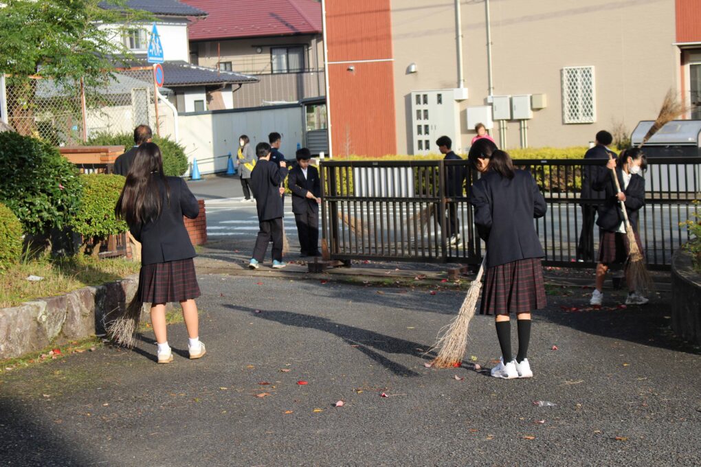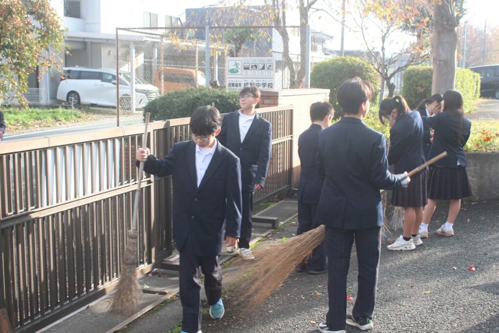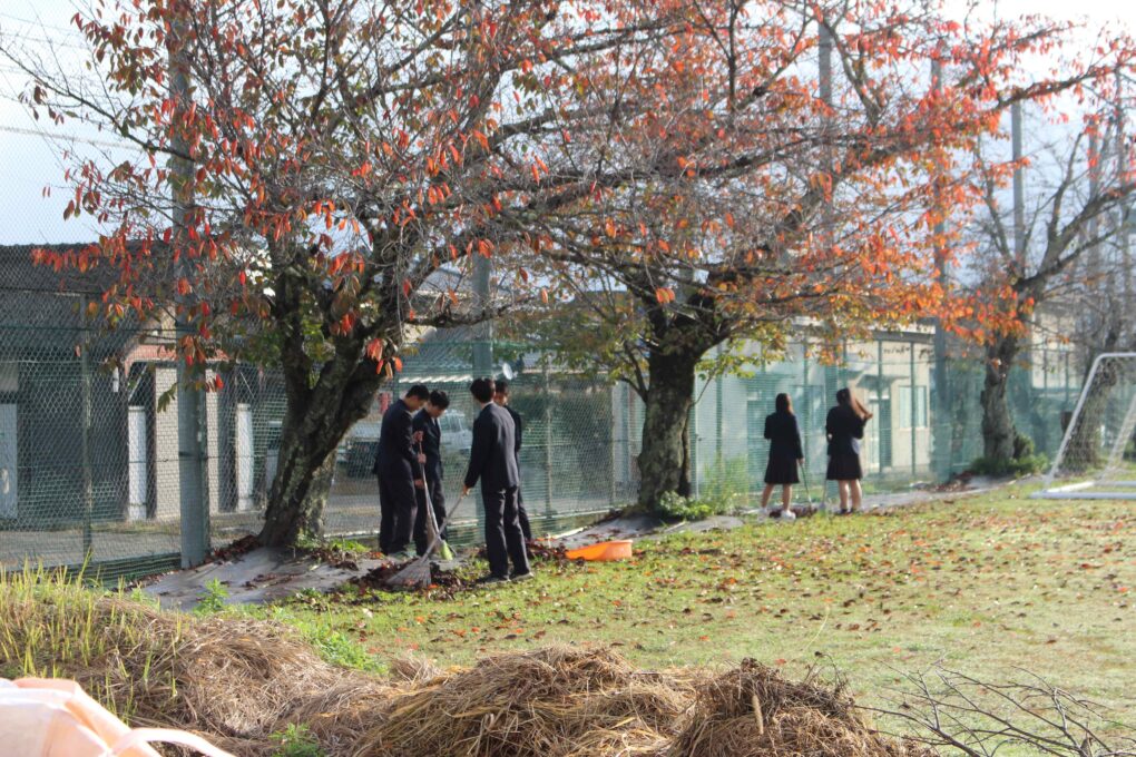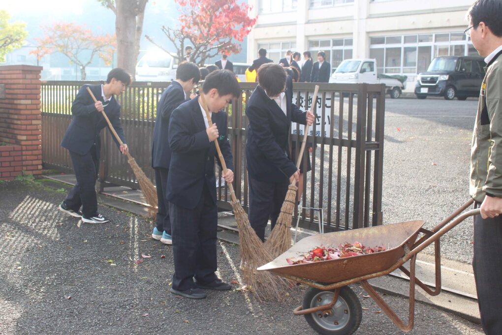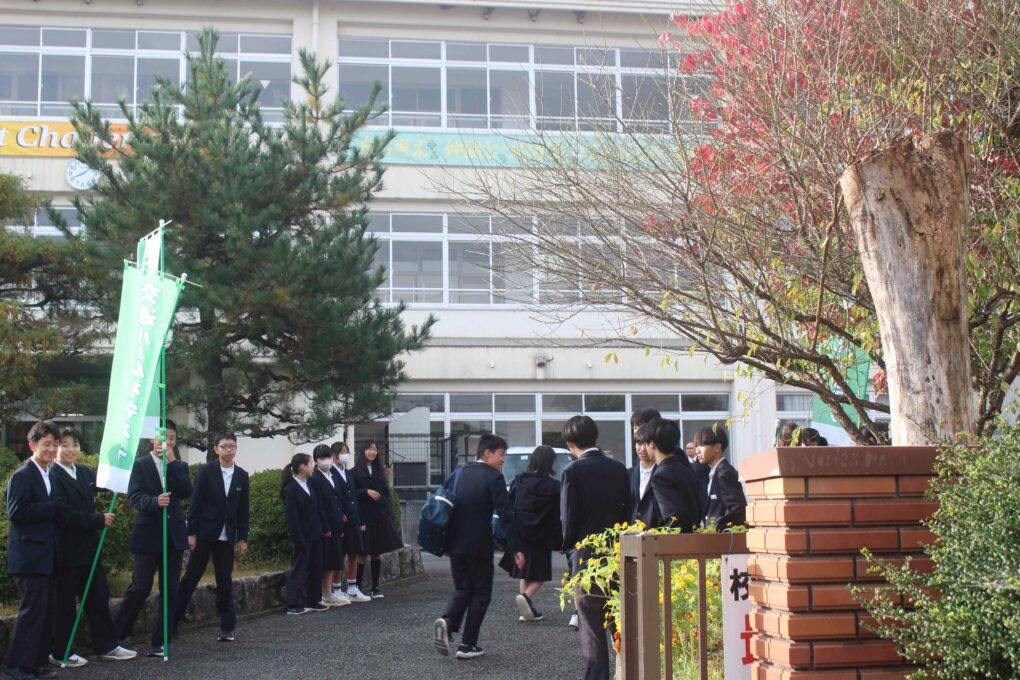 本日、生活委員会のあいさつ運動と環境委員会の環境整備が行われました。寒い日が増え、校門付近の落ち葉が目につくようになってきていましたが環境委員が竹ボウキを使って綺麗に掃除をしてくれました。生活委員も校門を入った所に並んで、登校してきた人達に気持ちの良いあいさつをしてくれていました。登校してきた生徒の皆さんもきっと気持ちの良いスタートを切ることができたのではないでしょうか。