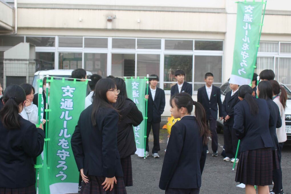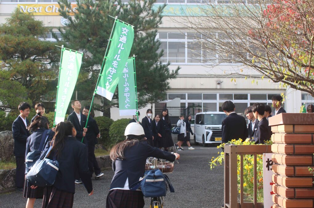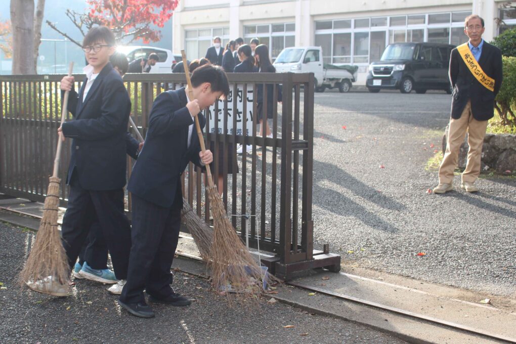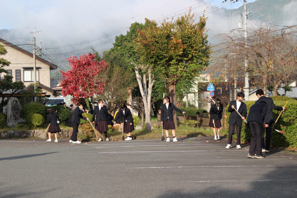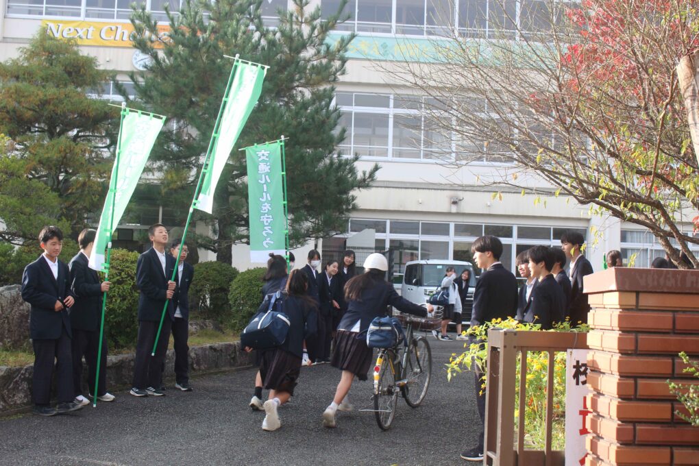 本日、生活委員会のあいさつ運動と環境委員会の環境整備が行われました。寒い日が増え、校門付近の落ち葉が目につくようになってきていましたが環境委員が竹ボウキを使って綺麗に掃除をしてくれました。生活委員も校門を入った所に並んで、登校してきた人達に気持ちの良いあいさつをしてくれていました。登校してきた生徒の皆さんもきっと気持ちの良いスタートを切ることができたのではないでしょうか。