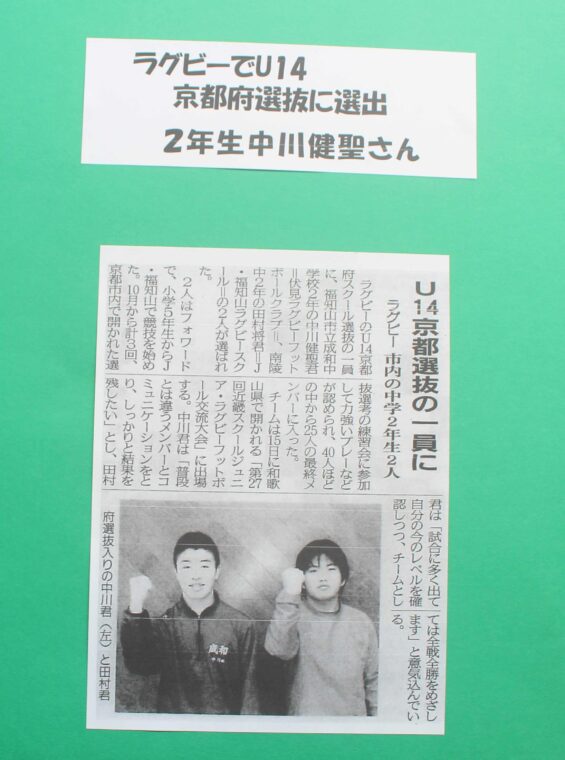 本校2年生の中川健聖さんがラグビーのU14 京都選抜に選ばれて、両丹新聞で紹介されました。本校ではソフトテニス部に所属しながら、一方で伏見ラグビーフットボールクラブに所属し、フォワードとして頑張っています。今回は選考のための練習会で力強いプレーなどが認められ、選抜されました。おめでとう!