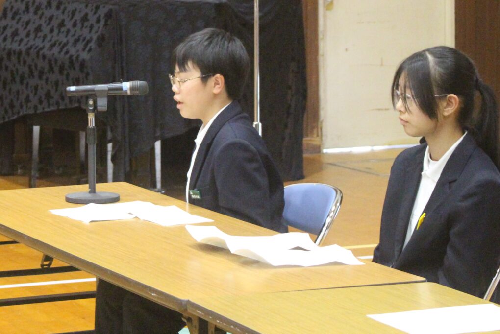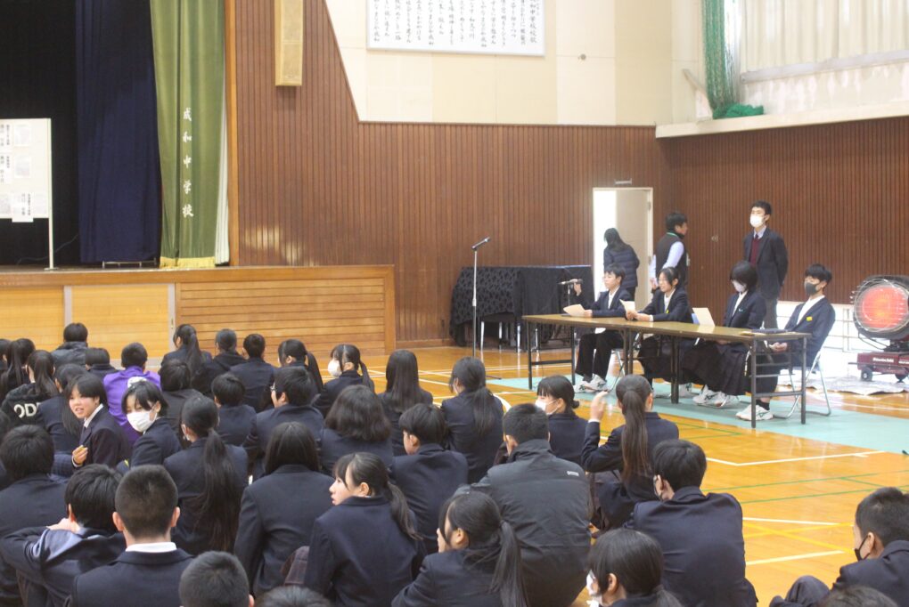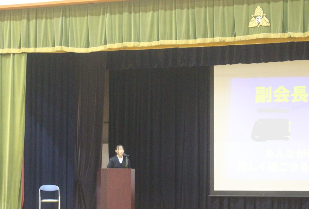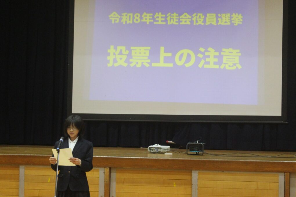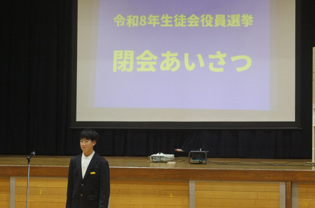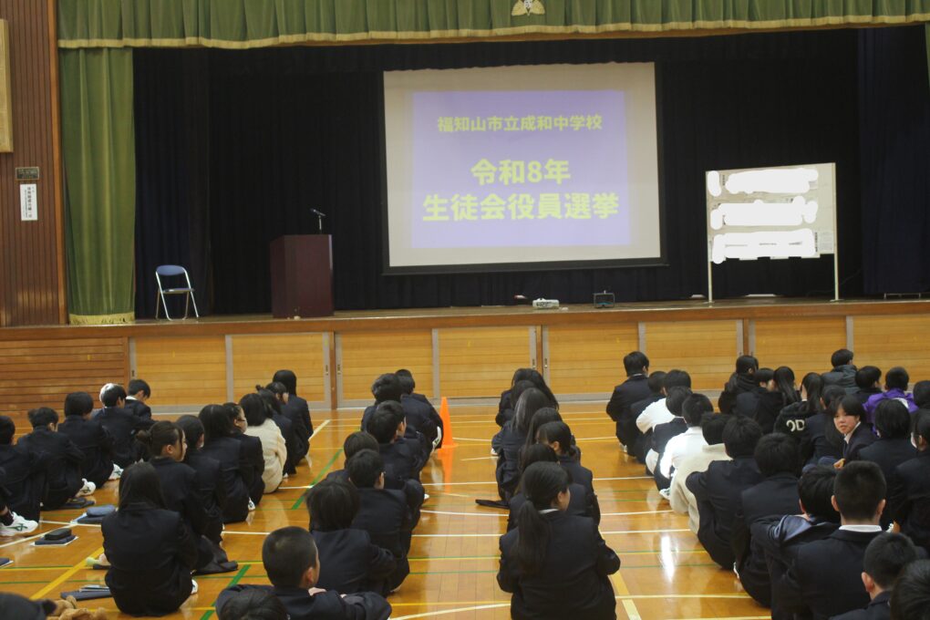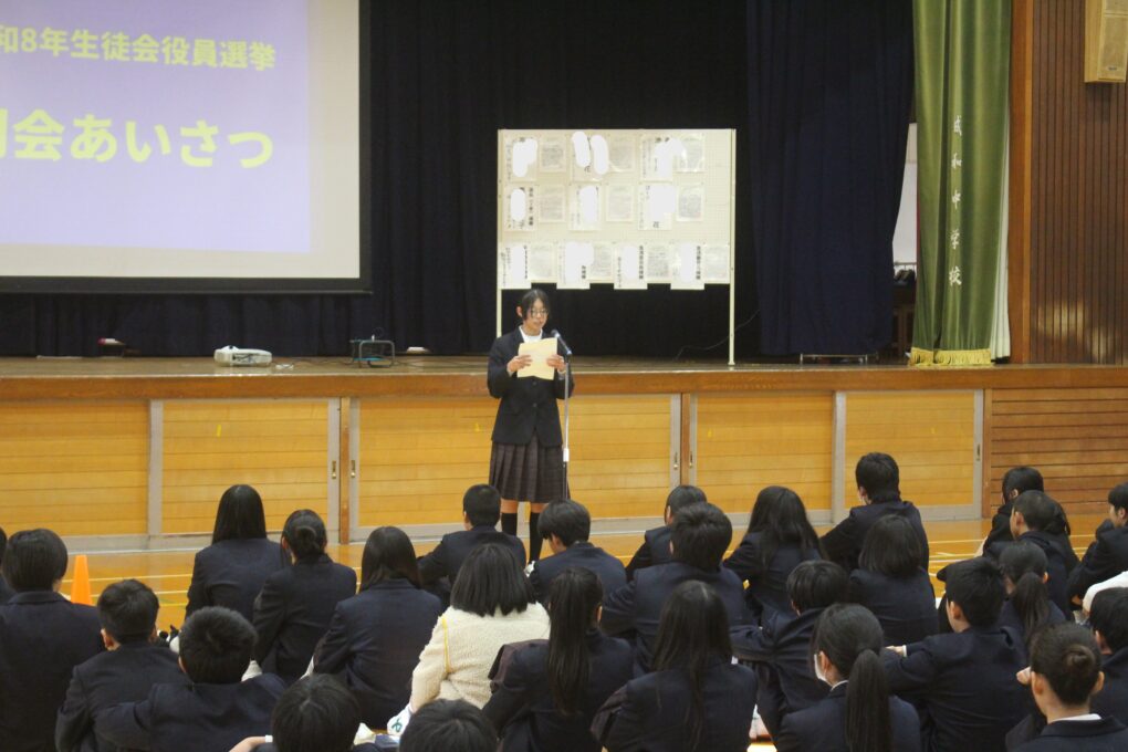本日の成和中本日6時間目に生徒会本部役員の立ち会い演説会が行われました。成和中学校を今よりも更にいい学校にしようという強い思いを持った1年生、2年生のリーダー達が立候補し、それぞれの強い思いを全校生徒(1.2年)に伝え、投票を行いました。学校を良くするのはリーダーだけでは、できないことです。成和中のみんなのリーダーシップとフォロアーシップで良き伝統を継承し、新しい成和中学校づくりを進めてほしく思います。選挙管理委員のみなさんも進行等、ご苦労様でした。しっかりとした態度で会を進めてくれました。
